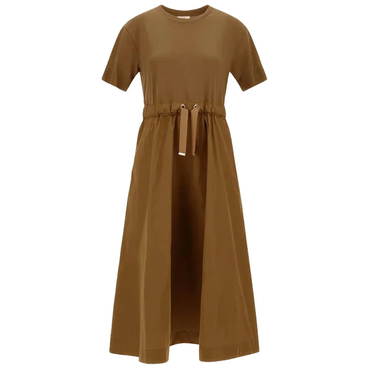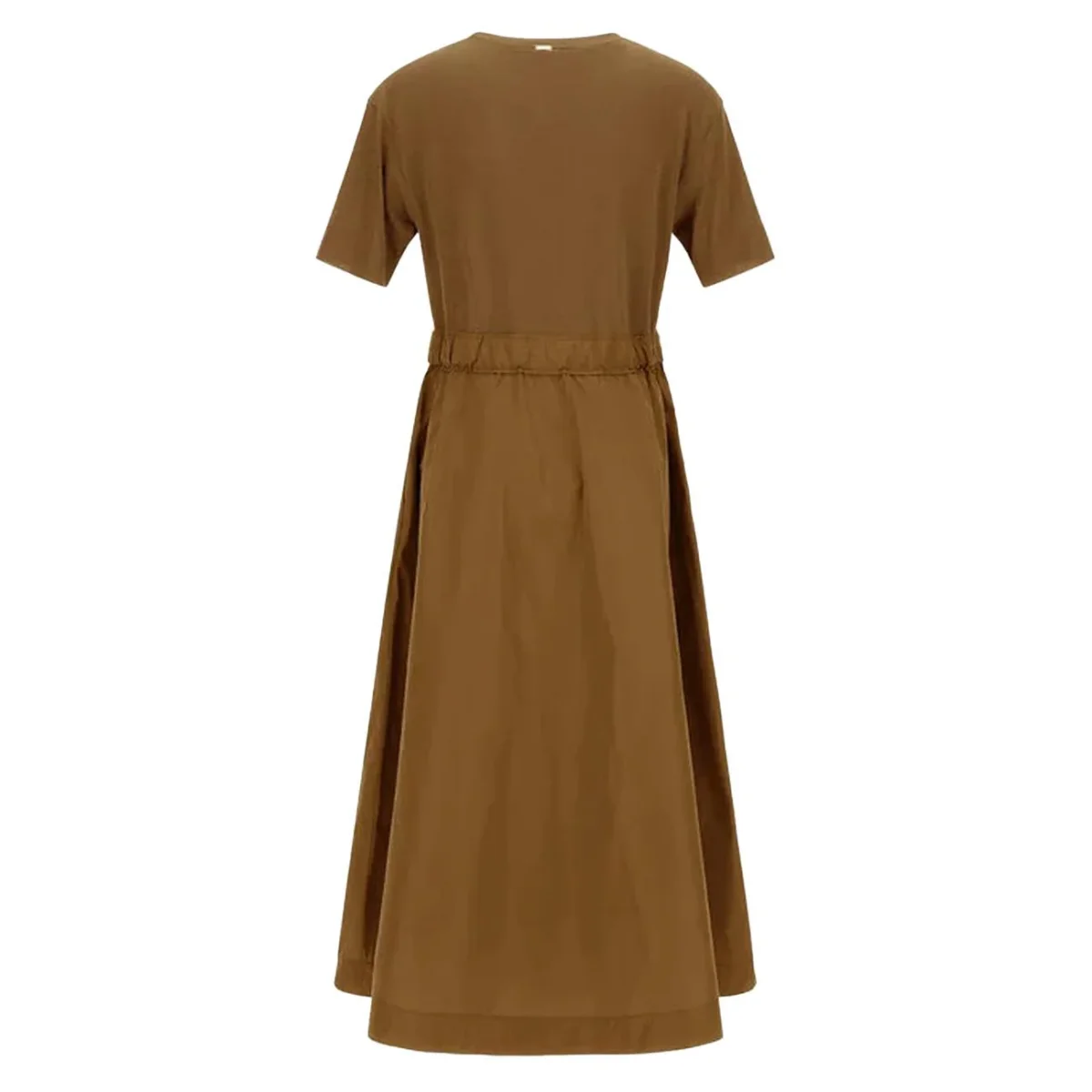 Abito DONNA – Modello: AB000032D520562157 – Colore: CAMMELLO Questo abito in jersey di cotone leggero e morbido offre comfort e stile, con dettagli lavorati a coste che richiamano un effetto tricot. La gonna, rifinita in taffetà con trattamento idrorepellente e un leggero finish cangiante, aggiunge un tocco sportivo ma elegante. Il design essenziale si arricchisce di dettagli pregiati, rendendo il capo perfetto per ogni occasione, dal quotidiano agli eventi speciali, con un semplice cambio di accessori. La vestibilità regolare, lo scollo rotondo, le maniche corte, l’elastico con coulisse in vita e le tasche sui fianchi garantiscono praticità e comfort, mentre il logo Herno in metallo sul retro completa il look con un tocco distintivo. Composizione: 100% poliestere