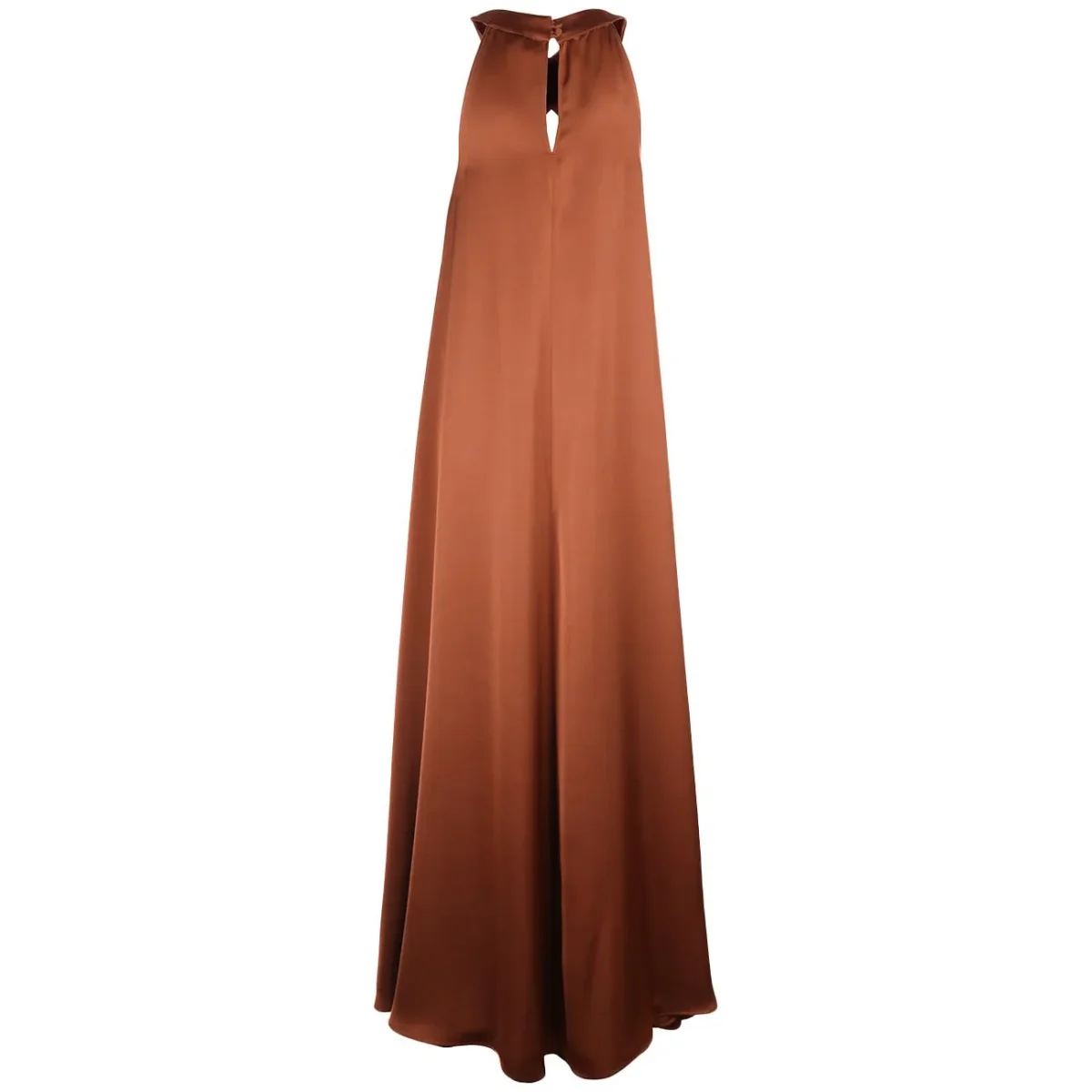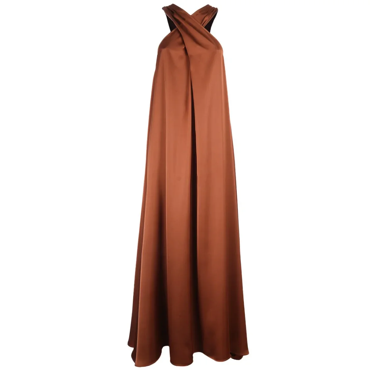 Questo abito lungo in raso Mascheroni incarna un glamour contemporaneo, esaltato dal tessuto lucido color marrone che avvolge la figura con una fluidità sensuale. Il collo halter che si incrocia sul décolleté crea un elegante effetto drappeggiato, mettendo in risalto la linea della schiena con raffinata leggerezza. La silhouette morbida e la lunghezza maxi donano un movimento regale a ogni passo. Pensato per serate speciali e cerimonie, esprime un’eleganza impeccabile e di forte impatto visivo.