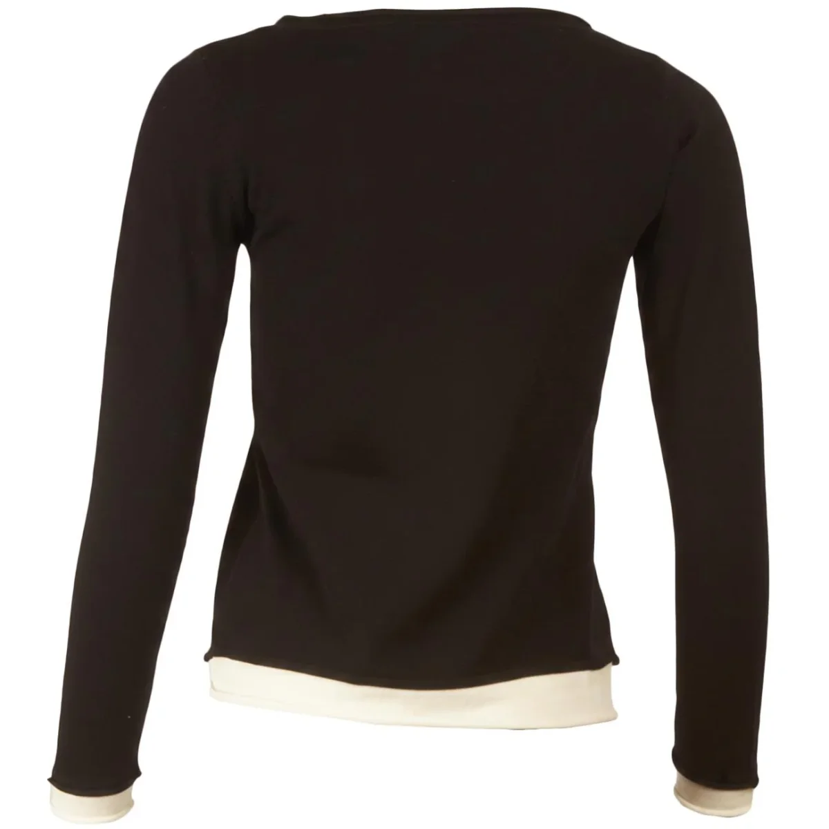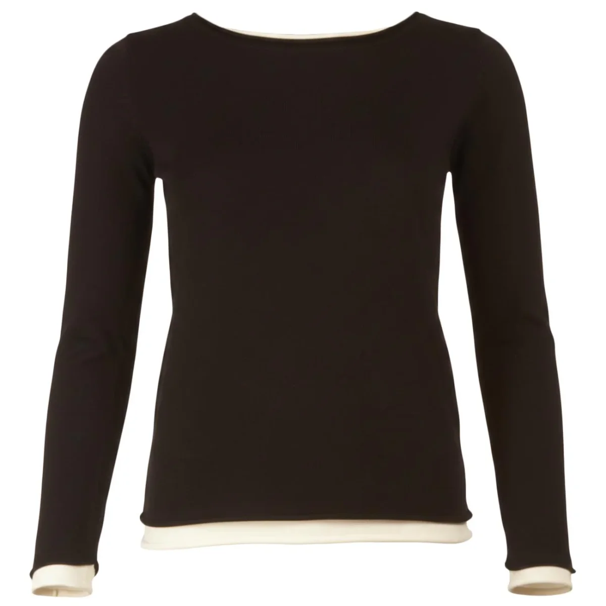 Questa raffinata maglia con scollo a barca e maniche lunghe si distingue per un design sofisticato, caratterizzato da eleganti inserti a contrasto che simulano un ricercato gioco di sovrapposizioni. La silhouette pulita è rifinita con bordi a taglio vivo rollè sul fondo e sui polsini, aggiungendo una nota contemporanea al classico nero. Realizzato con una trama liscia e regolare, il capo offre una vestibilità impeccabile che valorizza la figura con estrema naturalezza. È il passe-partout ideale per chi cerca un’estetica minimalista ma curata nei minimi dettagli, perfetta da abbinare a look sia formali che casual.