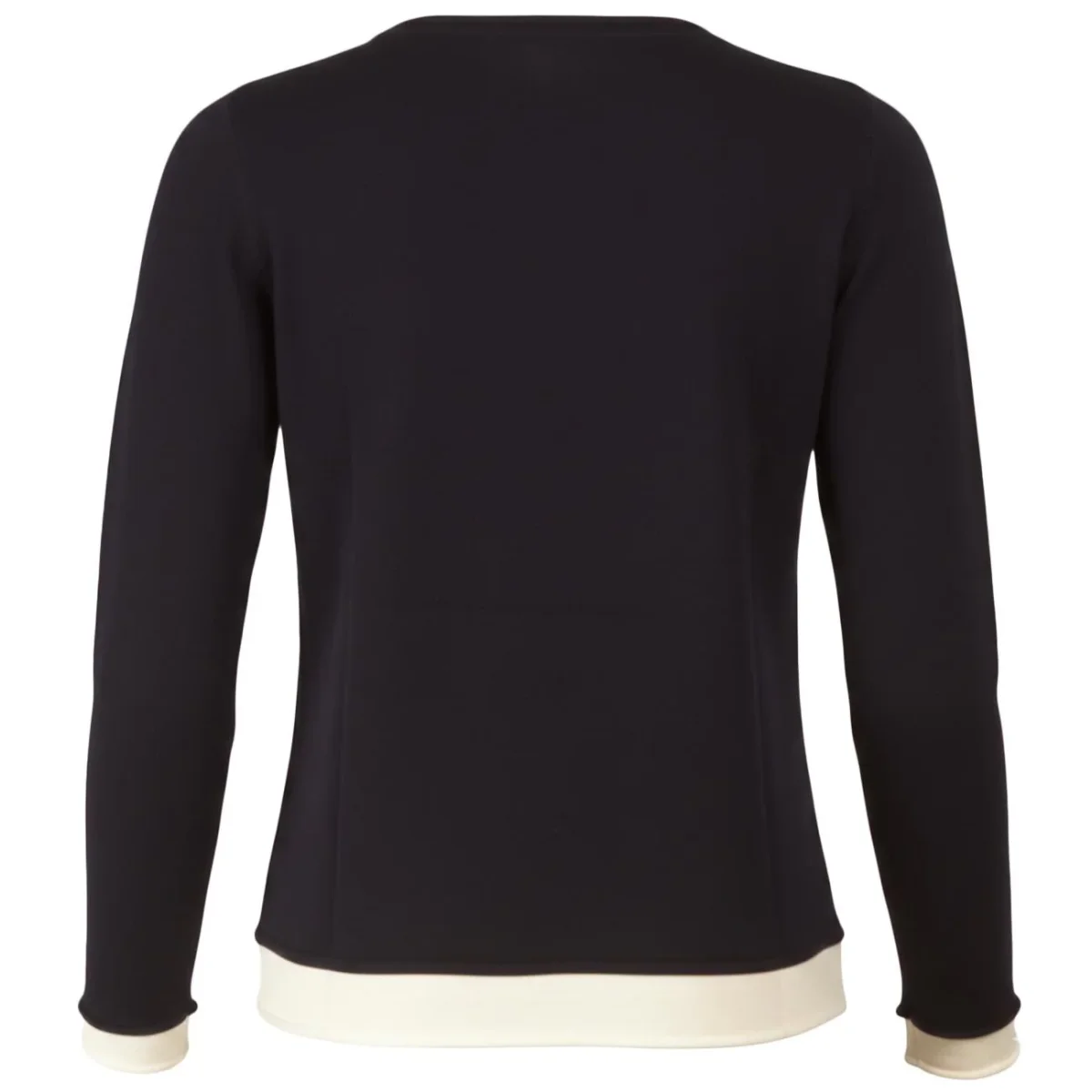 Questa raffinata maglia con scollo a barca e maniche lunghe si distingue per un design sofisticato, caratterizzato da eleganti inserti a contrasto che simulano un ricercato gioco di sovrapposizioni. La silhouette pulita è rifinita con bordi a taglio vivo rollè sul fondo e sui polsini, aggiungendo una nota contemporanea al classico blu navy. Realizzato con una trama liscia e regolare, il capo offre una vestibilità impeccabile che valorizza la figura con estrema naturalezza. È il passe-partout ideale per chi cerca un’estetica minimalista ma curata nei minimi dettagli, perfetta da abbinare a look sia formali che casual.