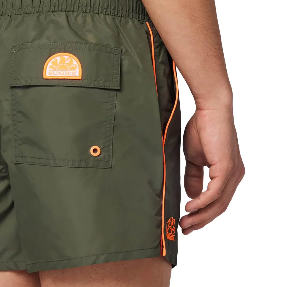 Bermuda UOMO – Modello: COLTRANE BOARDSHORT – Colore: DARK GREEN Boardshorts a tinta unita con inserti dai colori vivaci, con elastico e coulisse in vita, due tasche laterali, una tasca posteriore a toppa con patta chiusa da velcro e il logo Sundek in evidenza. COMPOSIZIONE: 100% Nylon Codice produttore: M700BDTA100