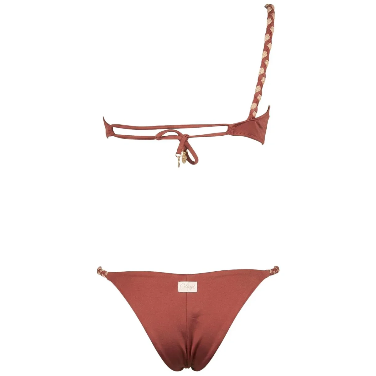 Bikini monospalla in lycra con treccia e coppe estraibli. Un basic con un tocco glamour che non può mancare nel tuo armadio.