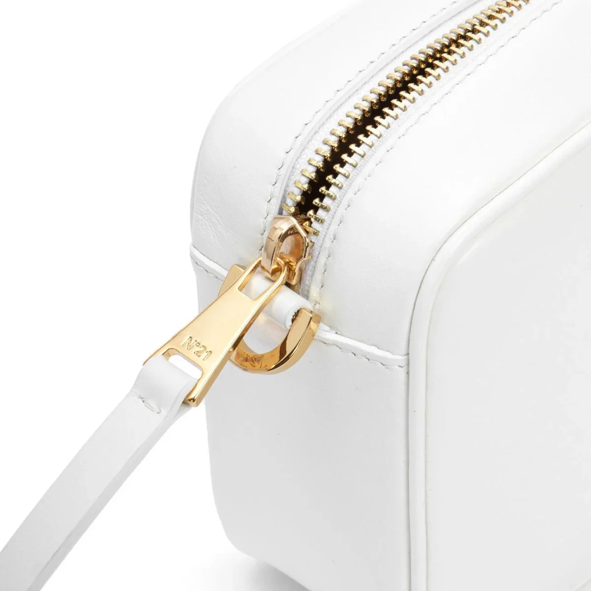 Borsa in pelle di colore bianco con placca logata N° 21 di colore oro. Tracolla regolabile e rimovibile in contrasto. Tasca aperta frontale e chiusura con zip.