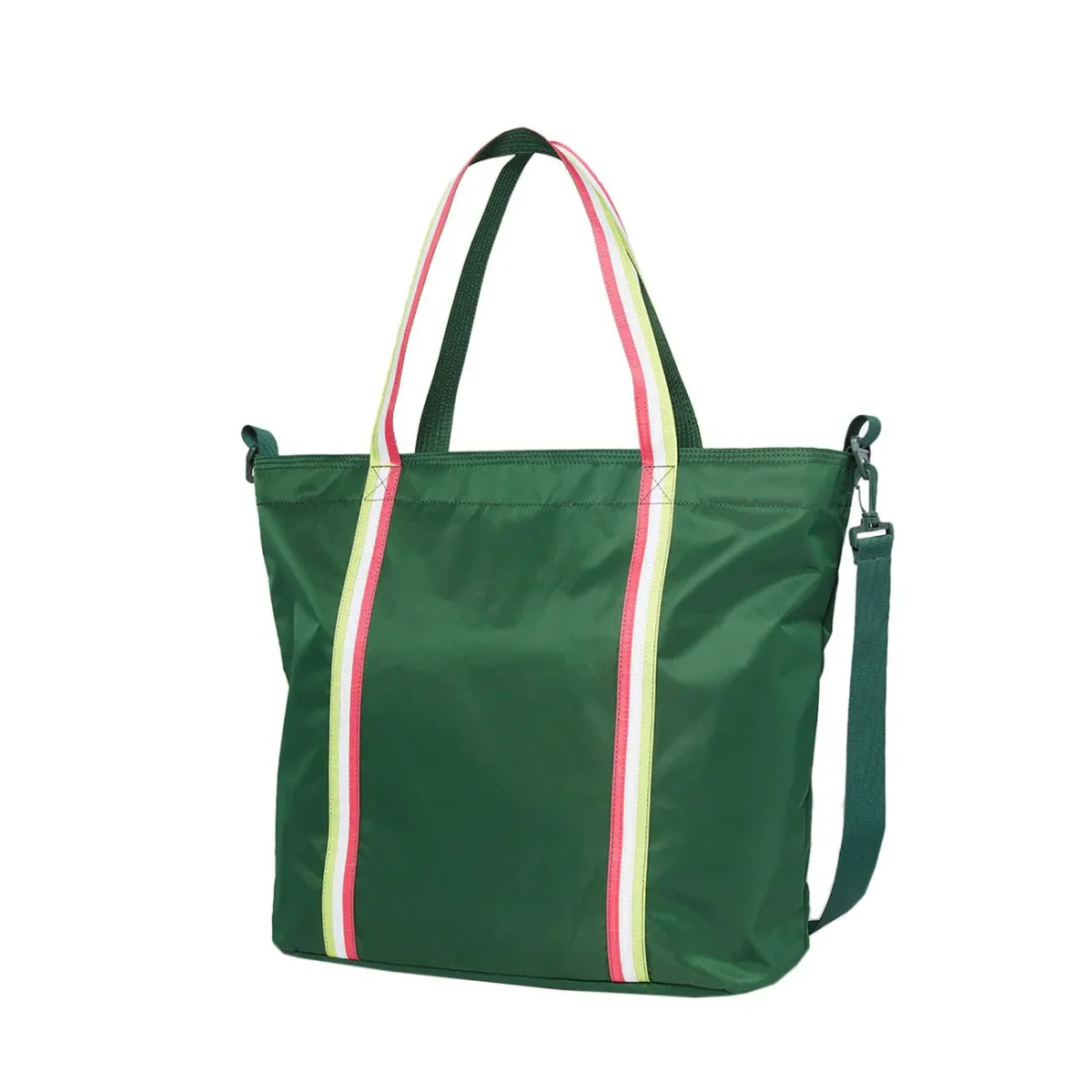 Borsa mare DONNA – Modello: BORSA MARE BON ARCOBALENO – Colore: PALMA Borsa da mare con nastri tricolor. Chiusura con zip, m anici in tessuto tricolore, t asca interna con chiusura zip e portachiavi staccabili. T racolla in tessuto regolabile e removibile. DIMENSIONE Altezza: 40 cm Larghezza: 56,5 cm Profondità : 20,5 cm Lunghezza manici: 62 cm COMPOSIZIONE Tessuto 100% poliestere
