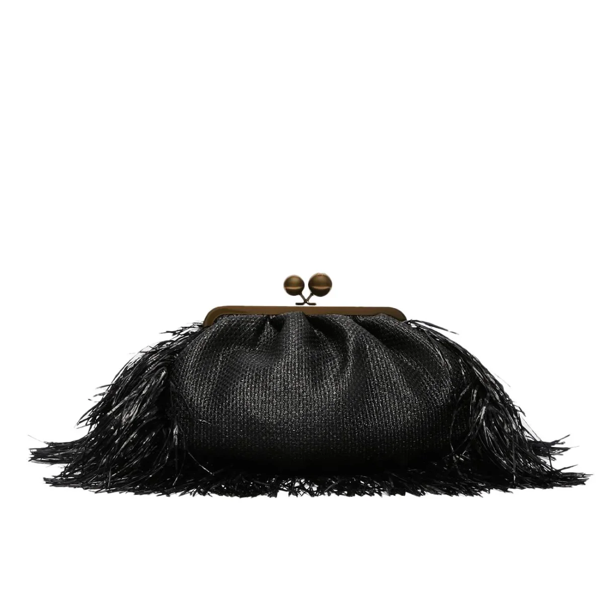 Borsa DONNA – Modello: PASTICCINO BELFORD – Colore: NERO Pasticcino bag medium realizzata interamente in tessuto effetto rafia e con dettaglio frange sul fondo. Dettaglio doppia tracolla rimovibile una più corta in pelle coordinata e l’altra più lunga a catena con spallaccio in pelle. Fodera interna in twill a righe con tasca portaoggetti e label personalizzata. L’icona chiusura metallica con maxi sfere è rifinita con logo a farfalla inciso e logo Weekend Max Mara. La super clutch per dare un tocco personale e affascinante al tuo stile quotidiano! COMPOSIZIONE Borsa in 100% poliammide; fodera in poliestere. DIMENSIONI 31 x 13 x 21 cm.