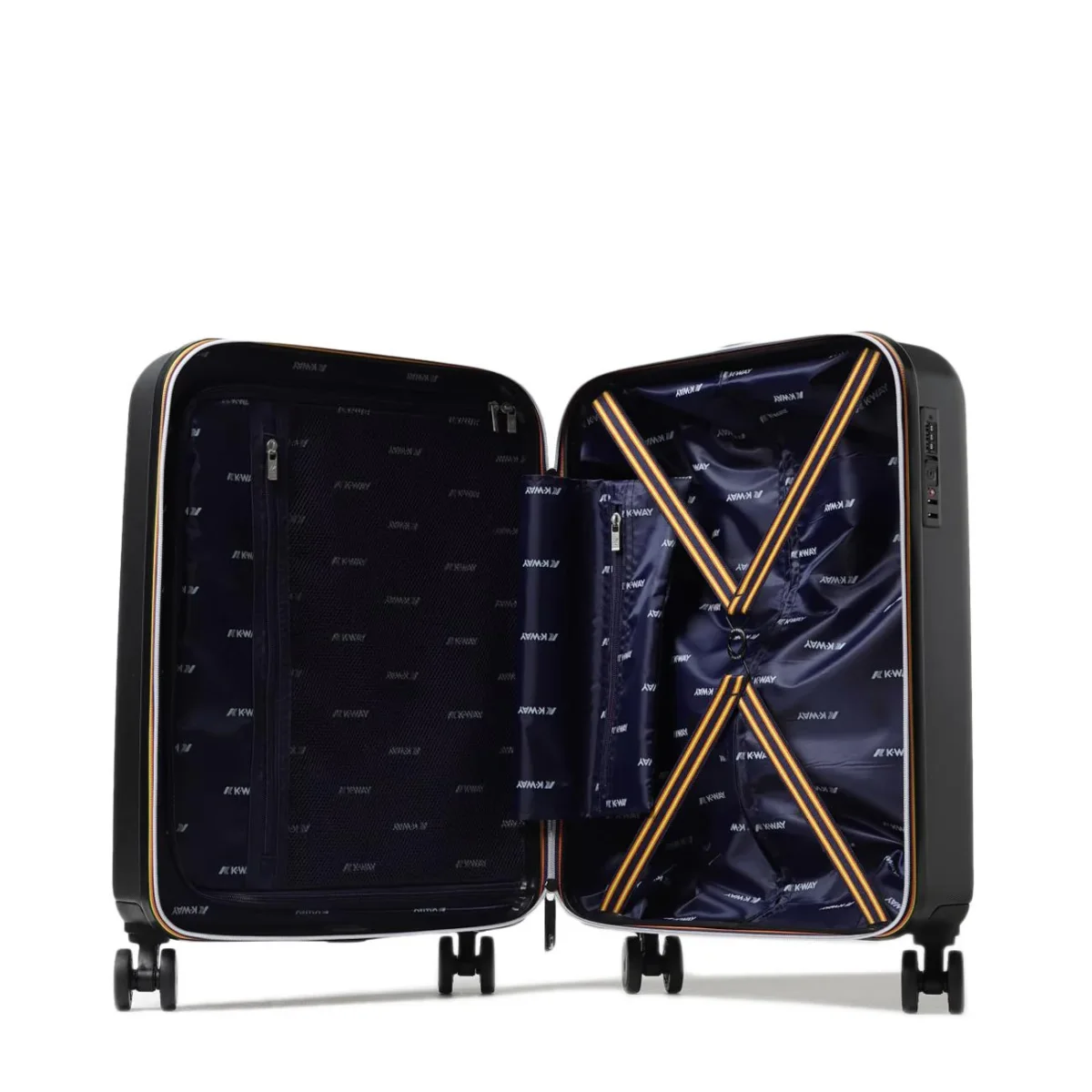 Cabin Trolley UNISEX – Modello: CABIN TROLLEY SMALL – Colore: BLACK PURE BLUE COBALT Trolley rigido da viaggio con maxi logo K-Way sul davanti della dimensione perfetta per essere portato in cabina. Presenta quattro ruote girevoli a 360°, tre tasche con zip all’interno ed elastici incrociati multicolor e chiusura con combinazione e TSA. Possiede inoltre tre tasche interne con zip, elastici interni incrociati multicolor ed infine maniglia estensibile in alluminio personalizzata. DIMENSIONI: cm 55 x cm 40 x cm 20