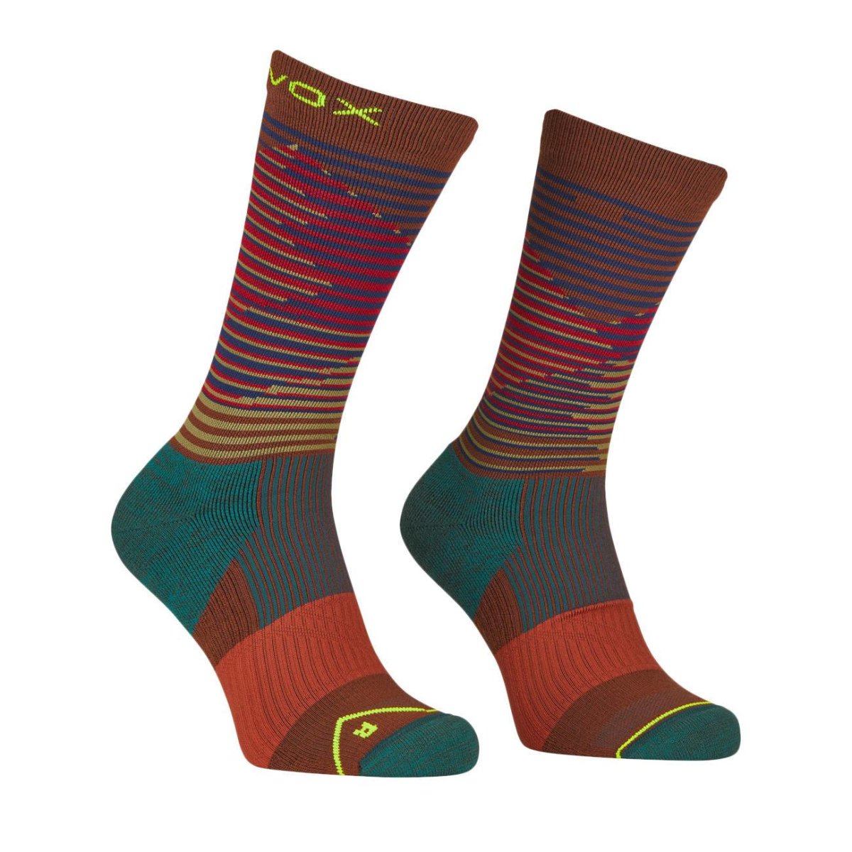 Calze UNISEX – Modello: ALL MOUNTAIN MID – Colore: CLAY ORANGE Calze tecniche realizzate in lana merino traspirante perfette per lunghe escursioni ad alta quota, sono in grado di regolare in modo naturale la temperatura e l`umidità , asciugandosi rapidamente neutralizzando gli odori sgradevoli. Il taglio ergonomico e il supporto per le caviglie e l`arco plantare assicurano una vestibilità confortevole. L`imbottitura sul tallone e sulle dita rende la calza resistente. COMPOSIZIONE: 42 % poliammide, 41 % lana vergine, 15 % poliammide riciclata, 2 % elastan Codice produttore: 54871