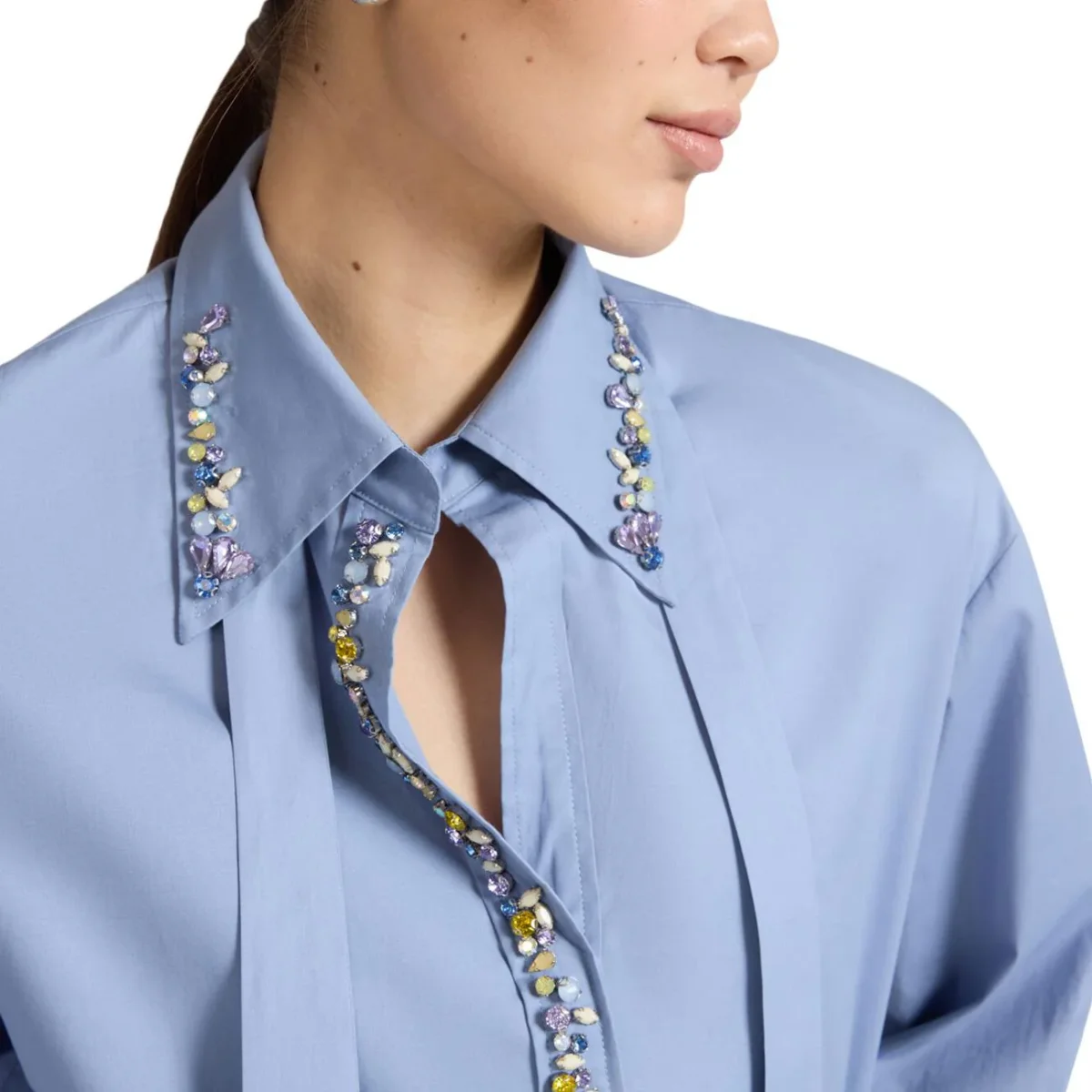 Questa camicia in morbido popeline di misto cotone eleva il classico taglio maschile grazie a preziosi cristalli applicati sui revers e lungo l’abbottonatura. La silhouette fluida è definita da una cintura coordinata rimovibile, ideale per valorizzare il punto vita con estrema versatilità . Il design è completato da maniche lunghe e ricami ricercati che aggiungono un tocco di luce sartoriale al capo. Perfetta abbinata a pantaloni classici per l’ufficio o a un denim per un look raffinato da sera.
