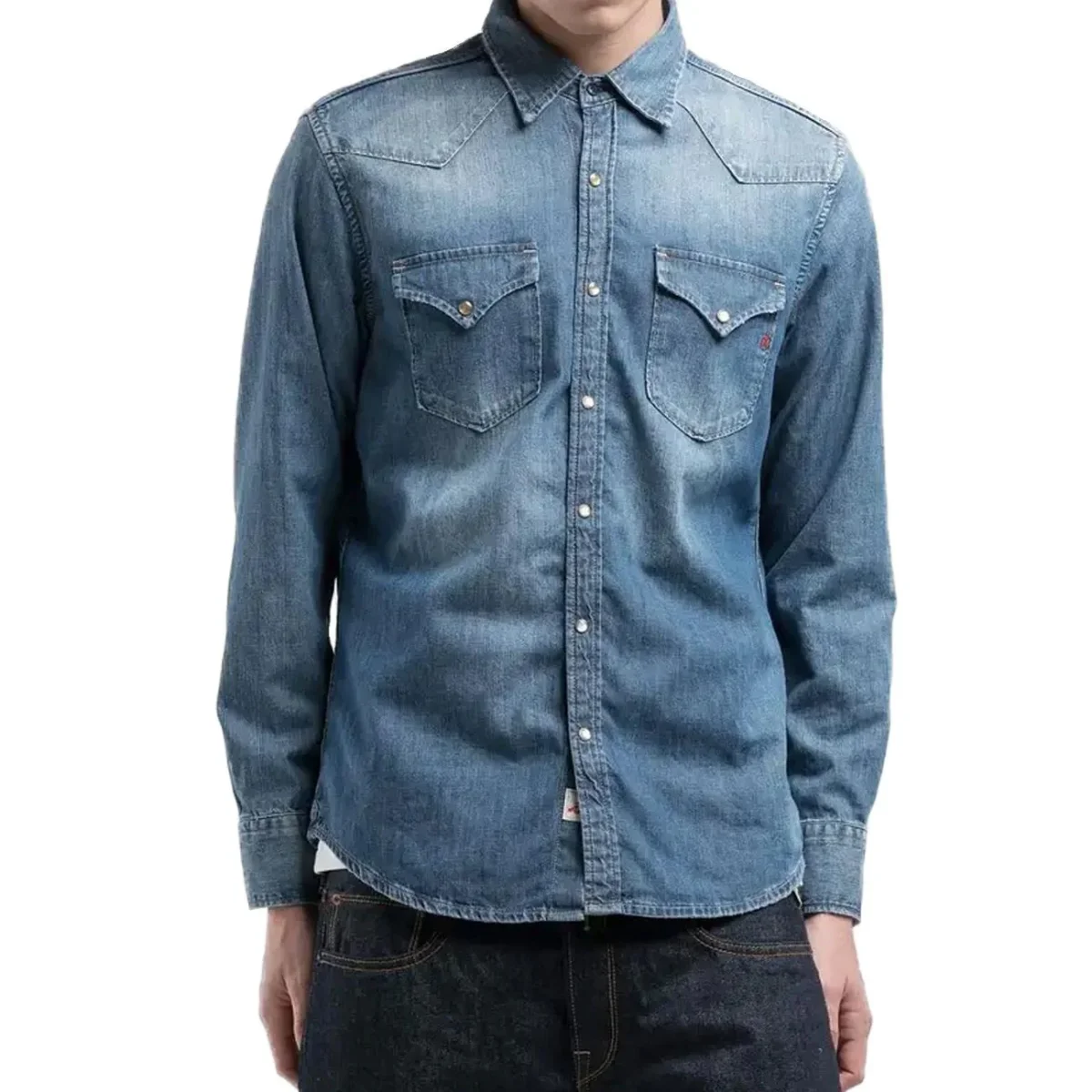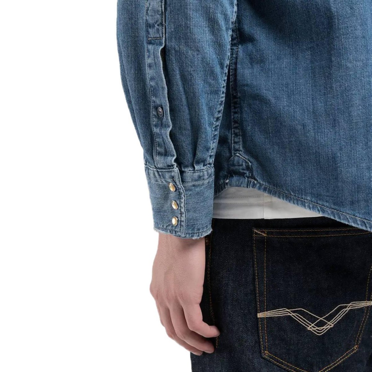 Camicia in denim UOMO – Modello: REGULAR FIT – Colore: BLU MEDIO Camicia a maniche lunghe in denim d’ispirazione western. Realizzata in indigo blu profondo denim di puro cotone, con trattamento enzimatico. Il capo si caratterizza per la graffiatura eseguita a mano che crea forti contrasti sulle zone d’usura. Presenta un orlo stondato e due tasche fortali con patta e bottoni a pressione, presenti anche sulla chiusura frontale e sui polsini. Su una delle due tasche frontali è inoltre presente l’iconico ricamo R. Questa camicia dallo stile urban e contemporaneo, ha vestibilità regolare, ed è ideale per un look casual ma alla moda. Composizione: 100% Cotone