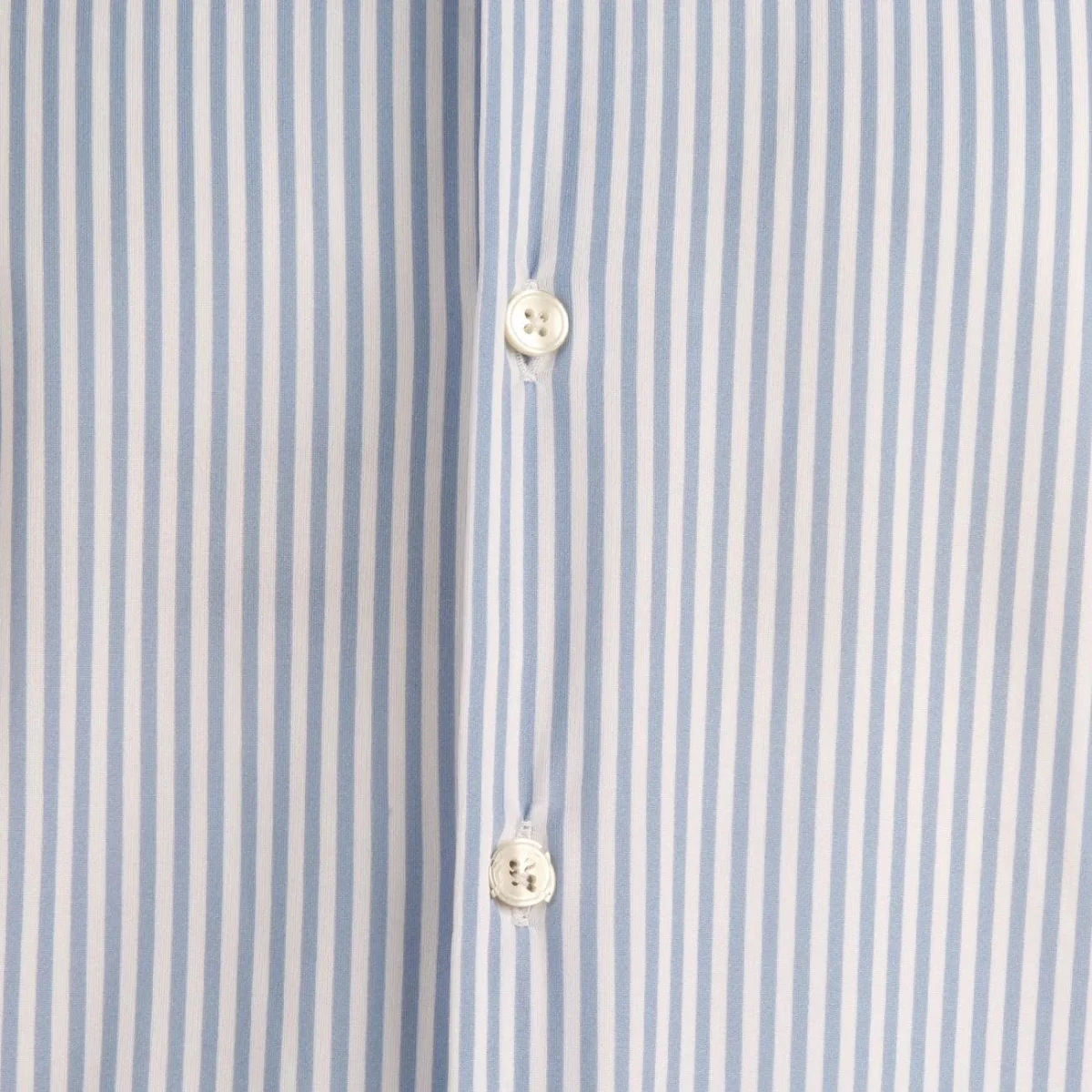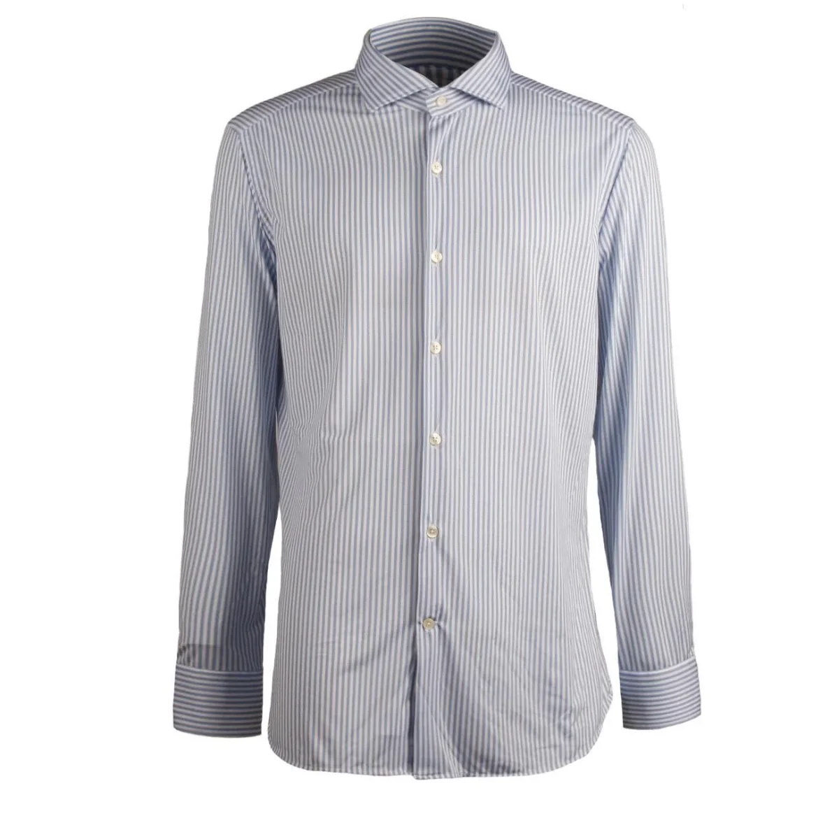 Camicia UOMO – Modello: TESSUTO TECNICO – Colore: BIANCO AZZURRO Camicia firmata guglielminotti realizzata in tessuto tecnico, a righe. Questa camicia dal taglio dritto presenta i classici polsini abbottonati, un colletto alla francese, degli spacchetti laterali e una chiusura centrale con fila di bottoni a vista. Codice produttore: QKNCJE