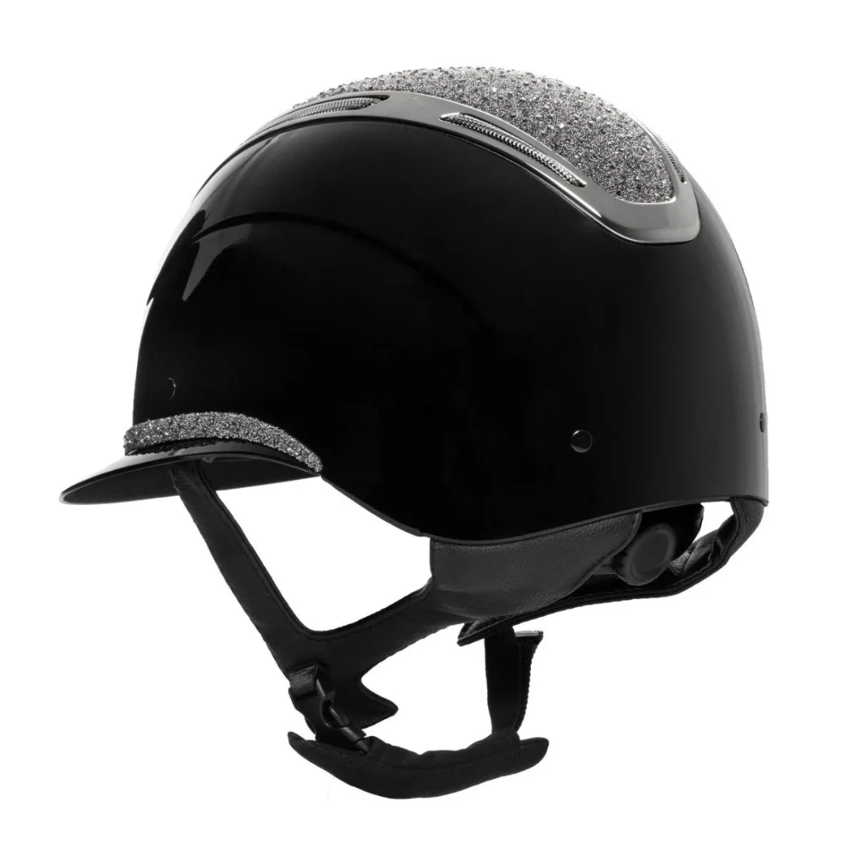 Cap con visiera larga e calotta lucida decorata con strass, realizzato con materiali di alta qualità che lo rendono estremamente resistente agli urti. Grazie alle prese d’aria frontali è dotato di un eccellente sistema di ventilazione. L’imbottitura interna, comoda e traspirante, è removibile in modo da garantire una facile manutenzione. Il morbido cinturino sottogola foderato in ecopelle è anallergico e antibatterico, presenta inoltre una chiusura a clip facilmente regolabile e comoda da indossare.