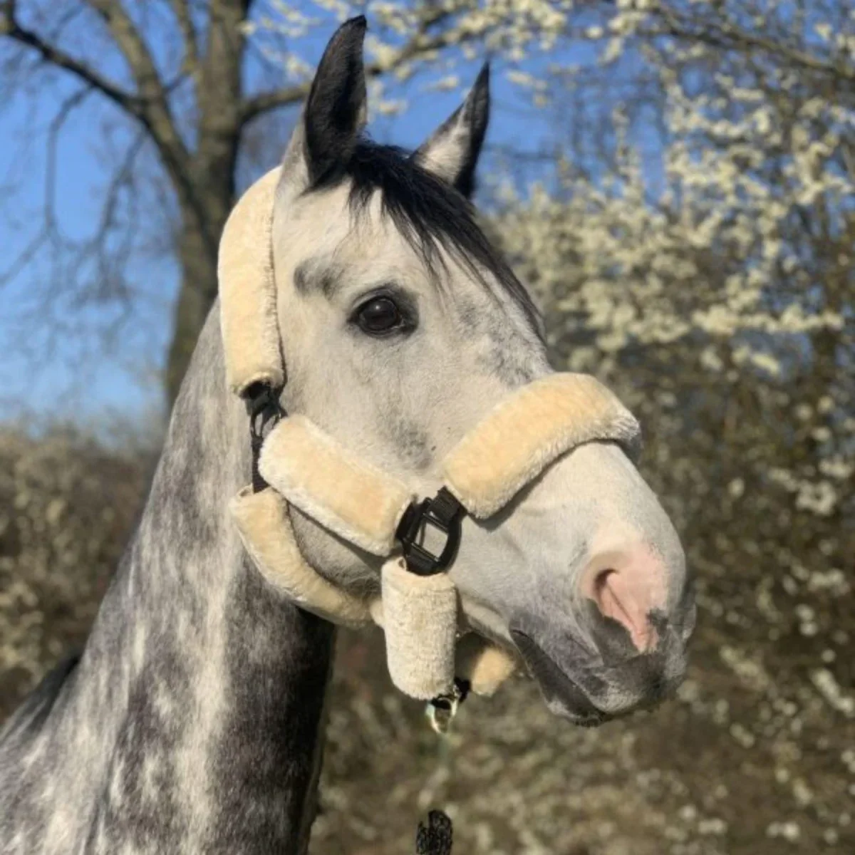Pratica capezza in Nylon ricoperta con agnellino sintetico, ideale per garantire il massimo comfort anche ai cavalli più sensibili.