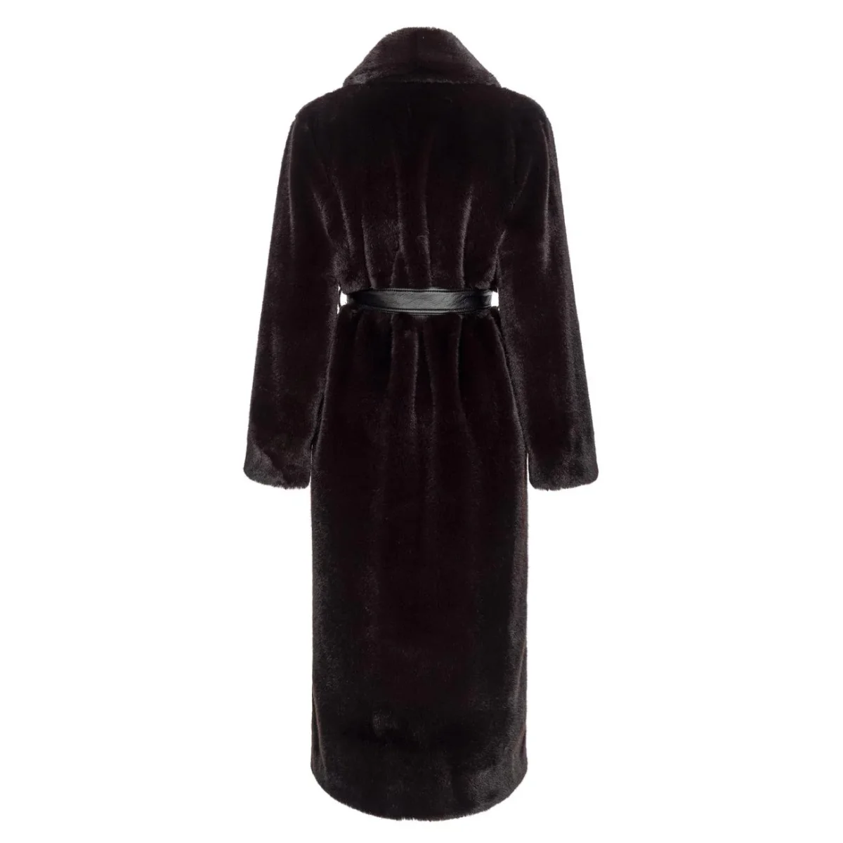 Cappotto DONNA – Modello: COMORE – Colore: MARRONE Cappotto lungo dalla linea fluida e decostruita in tessuto faux fur effetto pelliccia morbida a pelo corto e folto. La linea avvolgente del cappotto è completata da collo a rever sciallato, maniche lunghe e cintura abbinata in tessuto effetto pelle da annodare a vestaglia in vita. Un must-have tra i capospalla invernali. COMPOSIZIONE: 100% Poliestere