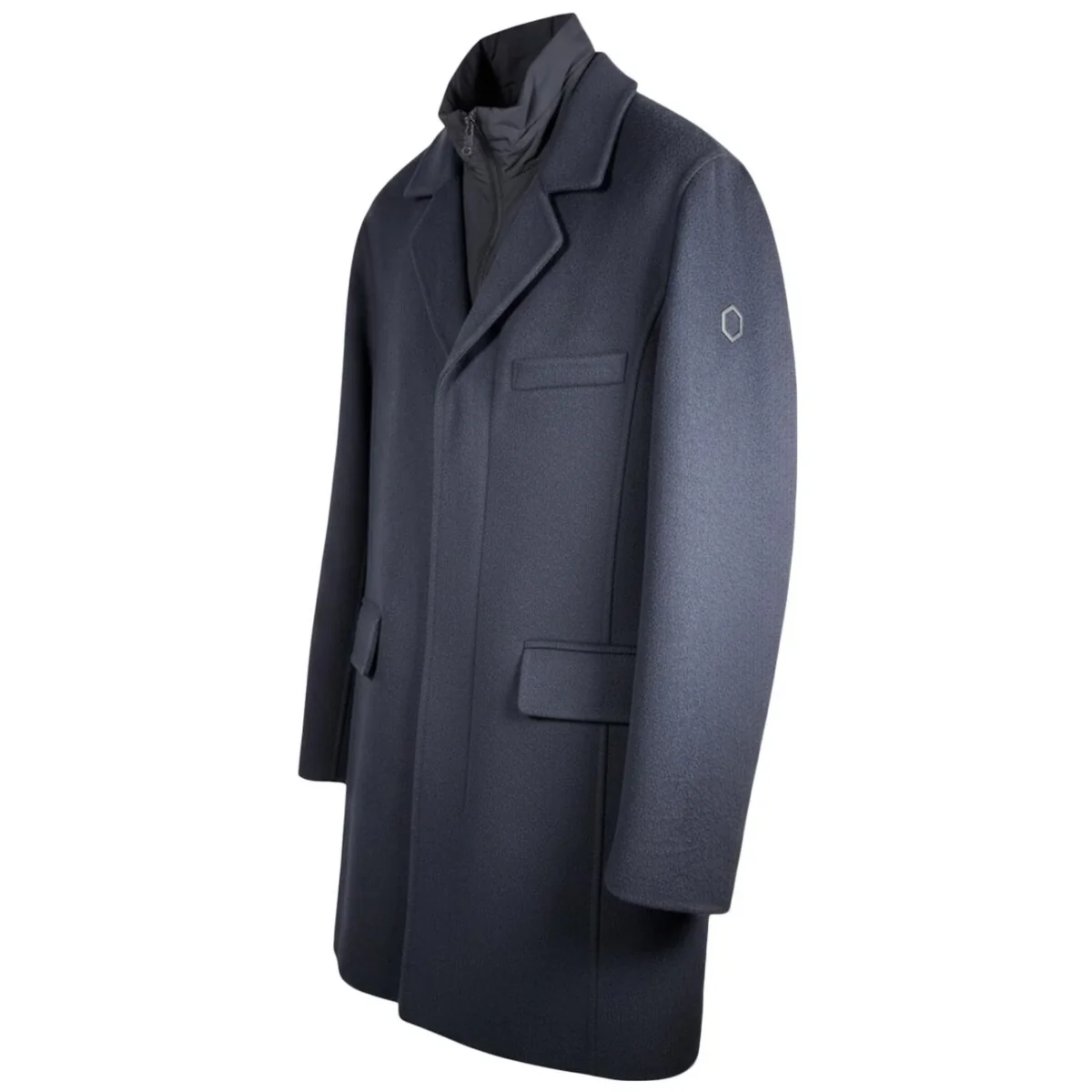 Il cappotto Hox in blu unisce eleganza classica e funzionalità contemporanea, realizzato in tessuto simile alla lana dalla texture morbida e calda. Il modello presenta una chiusura a tre bottoni e un revers a lancia, mentre il gilet interno trapuntato marrone aggiunge calore e un tocco moderno quando il capo è aperto. Le tasche laterali con patta mantengono la silhouette raffinata, e il logo esagonale sulla manica sottolinea la qualità premium del marchio. Perfetto per chi desidera un cappotto versatile, sofisticato e adatto sia a contesti formali che casual.