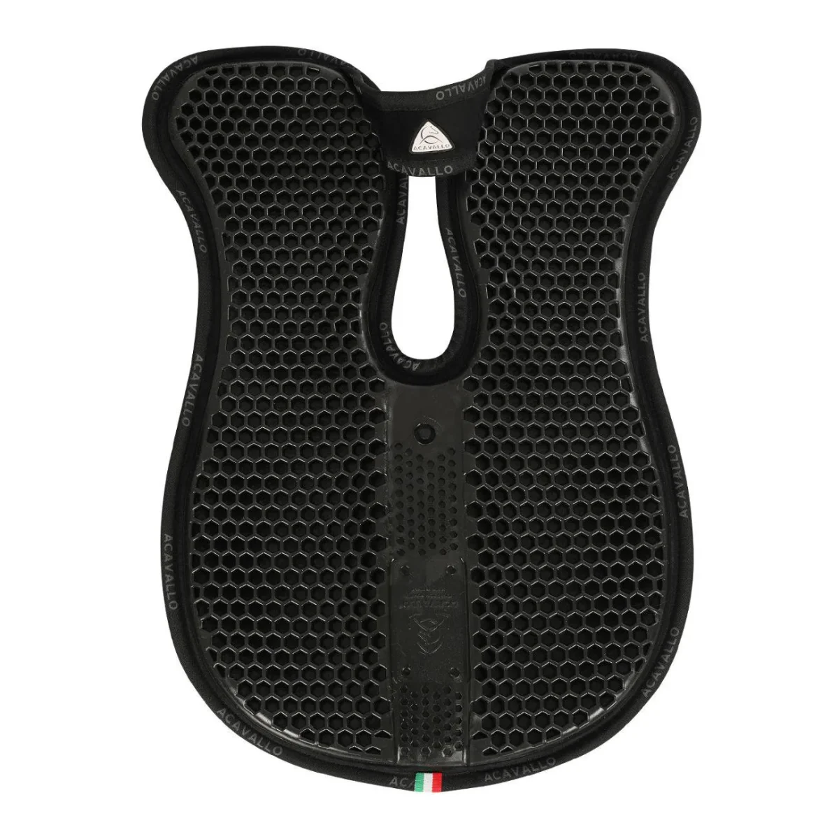 Il compensatore flat in memory foam con withers free shape in camoscio e gel hexagonal è progettato con tecnologie avanzate per garantire il massimo comfort e la distribuzione uniforme del peso. Il gel offre proprietà antiscivolo e ammortizzanti, mentre il memory foam assorbe gli urti e si adatta alla forma del cavallo. La struttura esagonale favorisce la circolazione dell’aria. Il gel Acavallo® è sicuro per la pelle, rendendo il compensatore adatto per l’uso diretto.