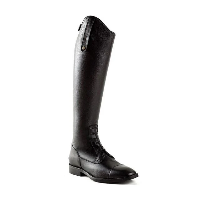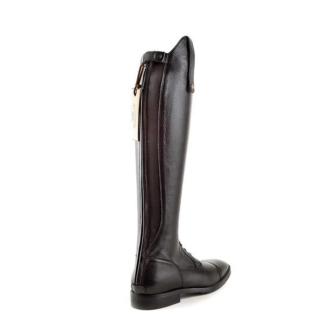Il modello De Niro Boot S3312 è lo stivale alto con lacci frontali tradizionali e zip posteriore progettato per una calzata precisa e pratica. La tomaia in vitello pieno fiore, la fodera in pelle e la soletta anatomica sostengono il piede nelle sessioni più lunghe; il pannello elastico a tutta lunghezza accanto alla zip agevola l’aderenza sul polpaccio senza comprimere. Il gambale sagomato favorisce il contatto con la sella, mentre la suola cuoio-gomma garantisce presa e durata. Una scelta versatile per lavoro in piano, salto e uso quotidiano, con un look classico in nero.