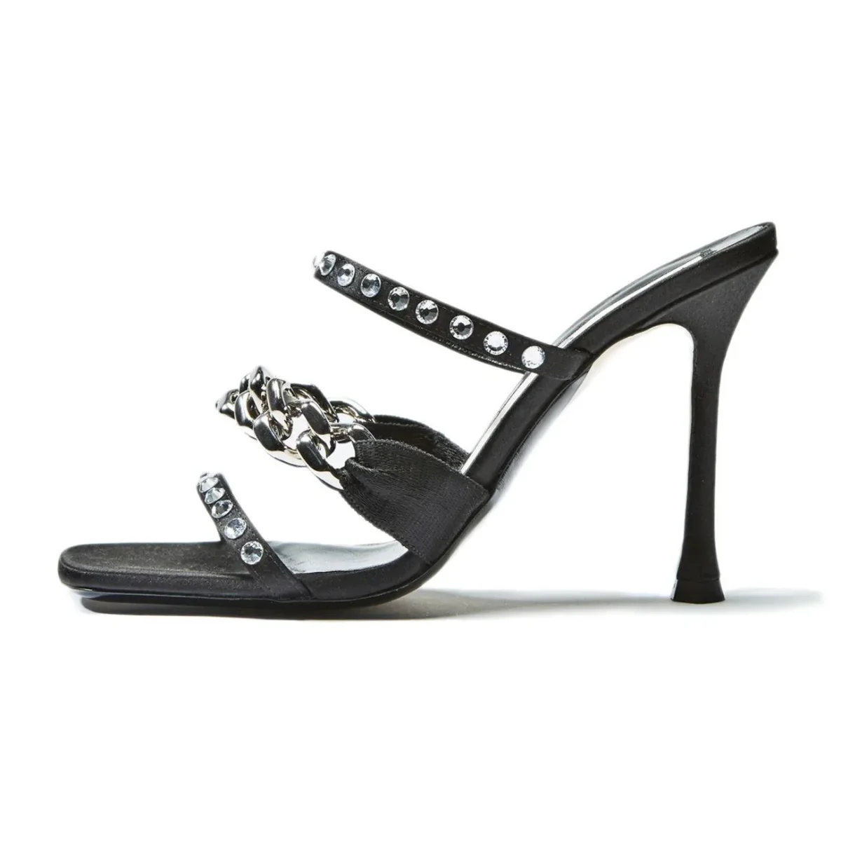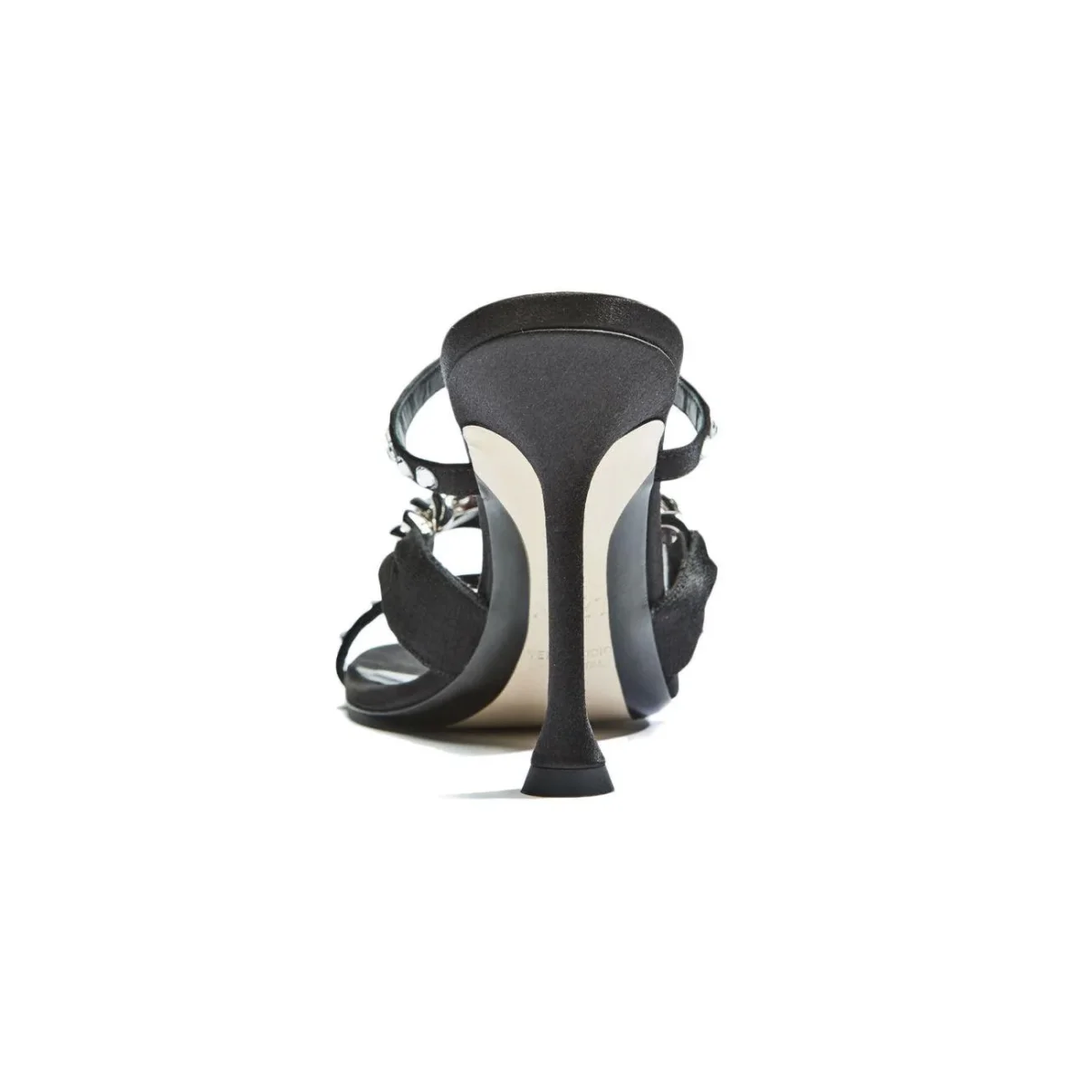 Decollete DONNA – Modello: SANDALO IN RASO CON CATENA E STRASS – Colore: BLACK Sandalo in raso con listini in strass e con catena argento. Punta squadrata e tacco alto a stiletto. Codice produttore: 21ECP0NV11071