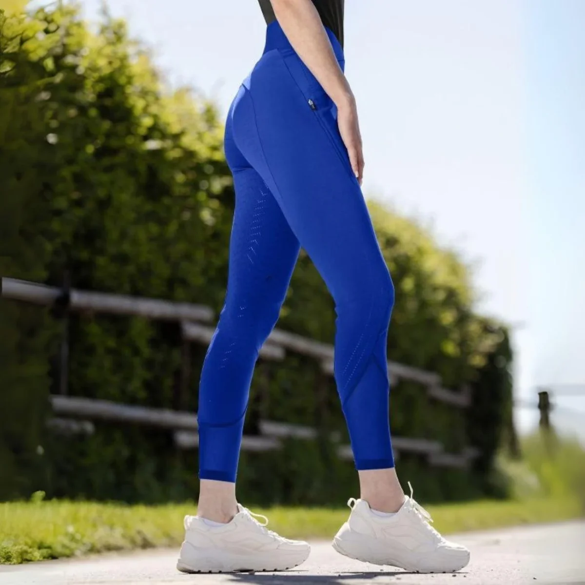 Leggings ELT Pia con full seat in silicone e dettagli laser-cut: tessuto traspirante e idrorepellente, vita alta a V elastica, fondo gamba in mesh e tasca con zip per smartphone sul fianco.