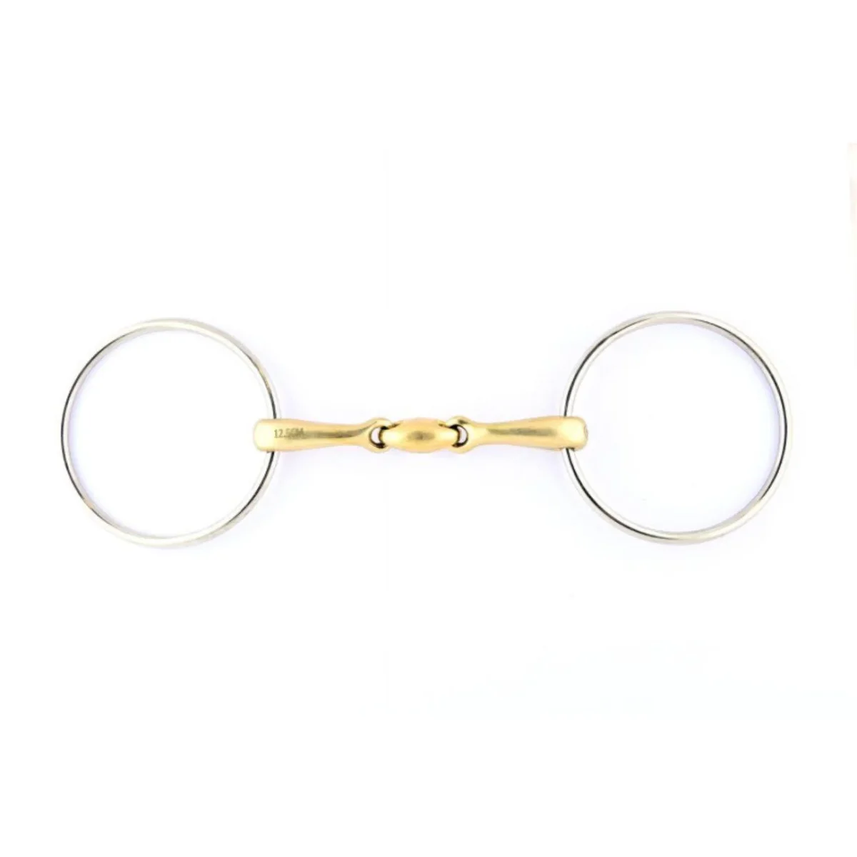 Filetto ad anelli con cannone intero, ideale per cavalieri che necessitano di un’imboccatura dall’azione stabile e decisa. La canna dritta in ottone esercita una pressione uniforme e costante, favorendo un contatto diretto con la mano del cavaliere e limitando le interferenze. La rigidità dell’imboccatura rende questo filetto adatto a cavalli ben addestrati, con una bocca ben stabilizzata, o a situazioni in cui si desidera ottenere maggiore precisione e fermezza nella comunicazione. L’ottone stimola naturalmente la salivazione, migliorando l’accettazione.