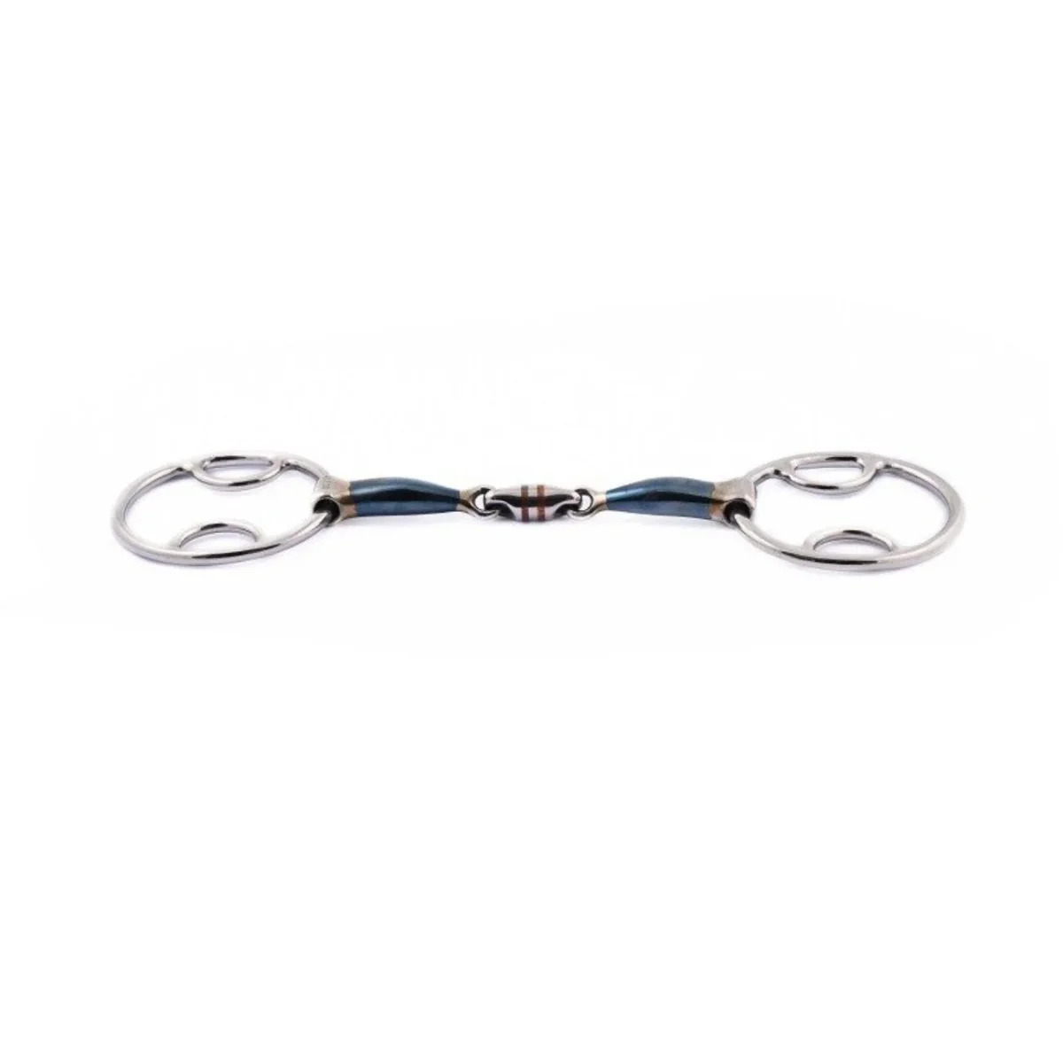 Filetto ad anelli mobili con doppio snodo e imboccatura rivestita in gomma sintetica aromatizzata alla menta. Il materiale morbido e flessibile è progettato per aumentare la salivazione e favorire il rilassamento della bocca. Il doppio snodo consente al filetto di seguire meglio l’anatomia della bocca del cavallo, evitando pressioni concentrate sul palato e distribuendo in modo più uniforme la sollecitazione tra lingua e barre. Questo design favorisce una comunicazione più precisa e delicata tra cavaliere e cavallo, migliorando la disponibilità al contatto.