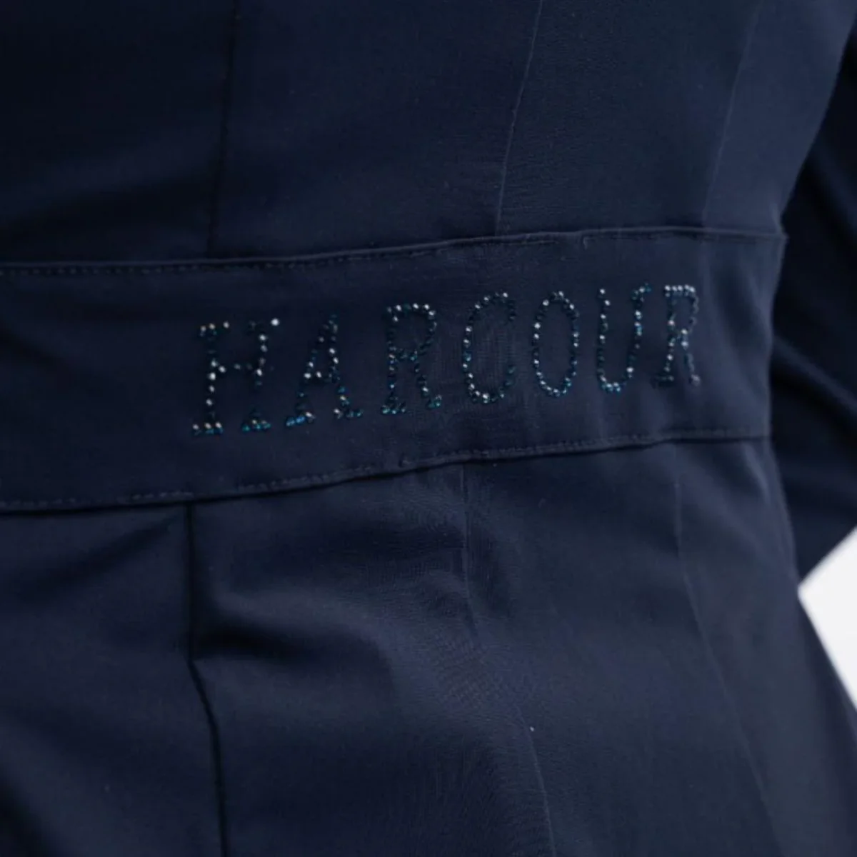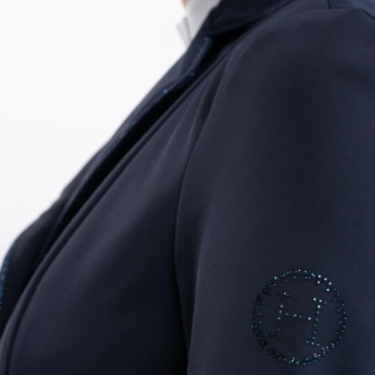 Giacca da concorso da donna dalla vestibilità slim, realizzata in tessuto traspirante “Rider Stretch”, per una maggiore libertà di movimento. Chiusura con cerniera e tre bottoni in strass tono su tono, due tasche anteriori con patta, tre bottoni con dettagli in strass tono su tono sulle maniche inferiori, il logo Harcour ricamato sulla manica sinistra ed il dettaglio di strass sul colletto ne completano il design.