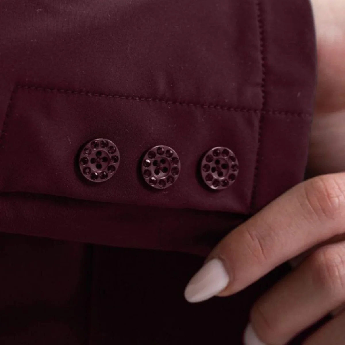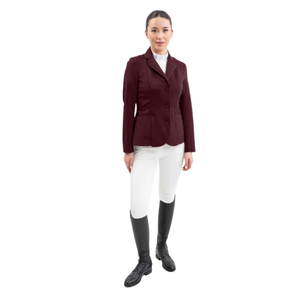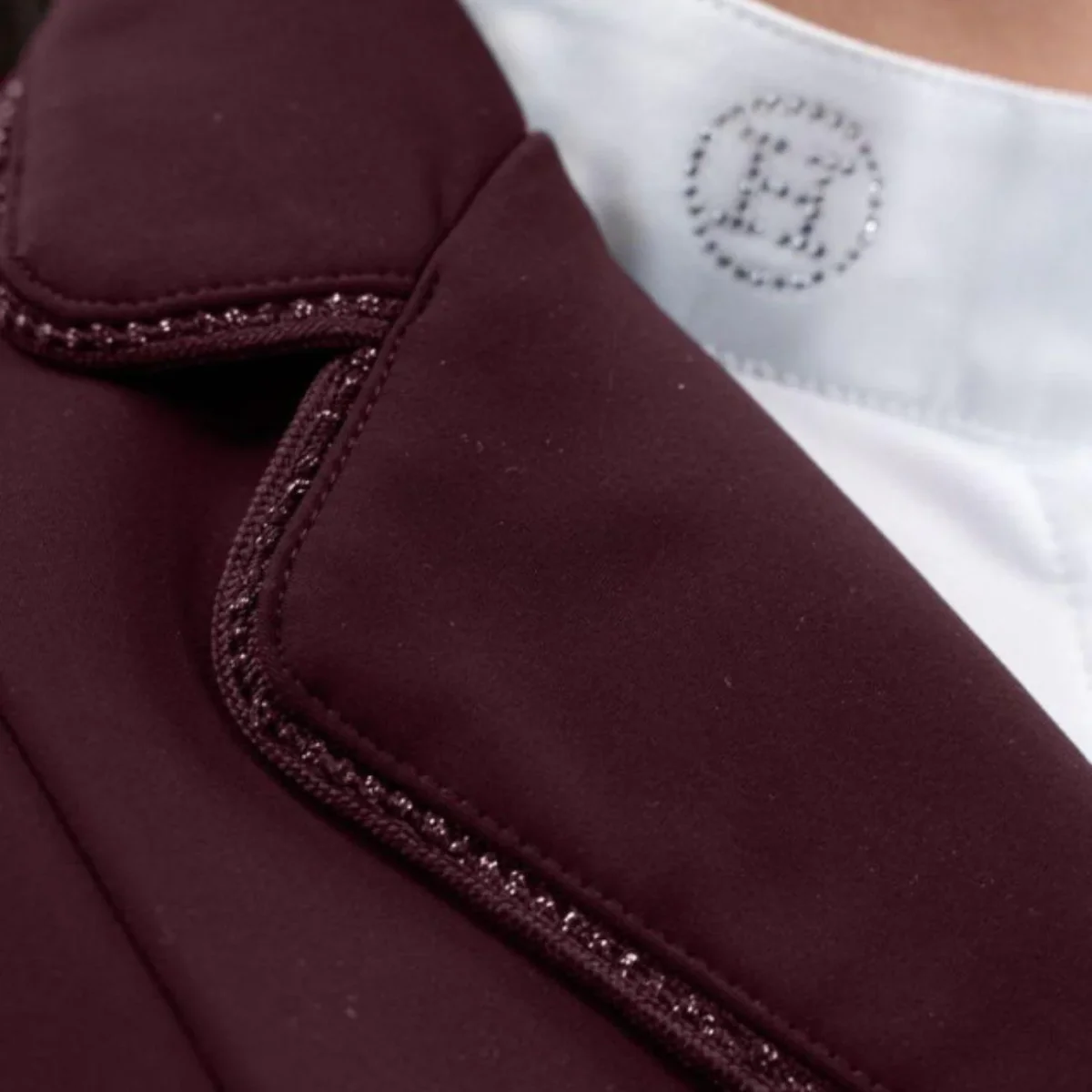 Giacca da concorso da donna dalla vestibilità slim, realizzata in tessuto traspirante “Rider Stretch”, per una maggiore libertà di movimento. Chiusura con cerniera e tre bottoni in strass tono su tono, due tasche anteriori con patta, tre bottoni con dettagli in strass tono su tono sulle maniche inferiori, il logo Harcour ricamato sulla manica sinistra ed il dettaglio di strass sul colletto ne completano il design.