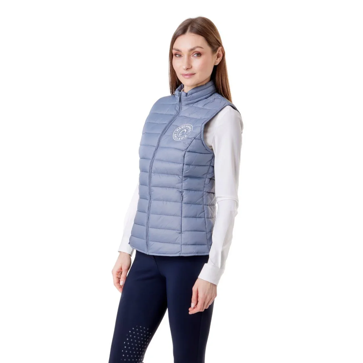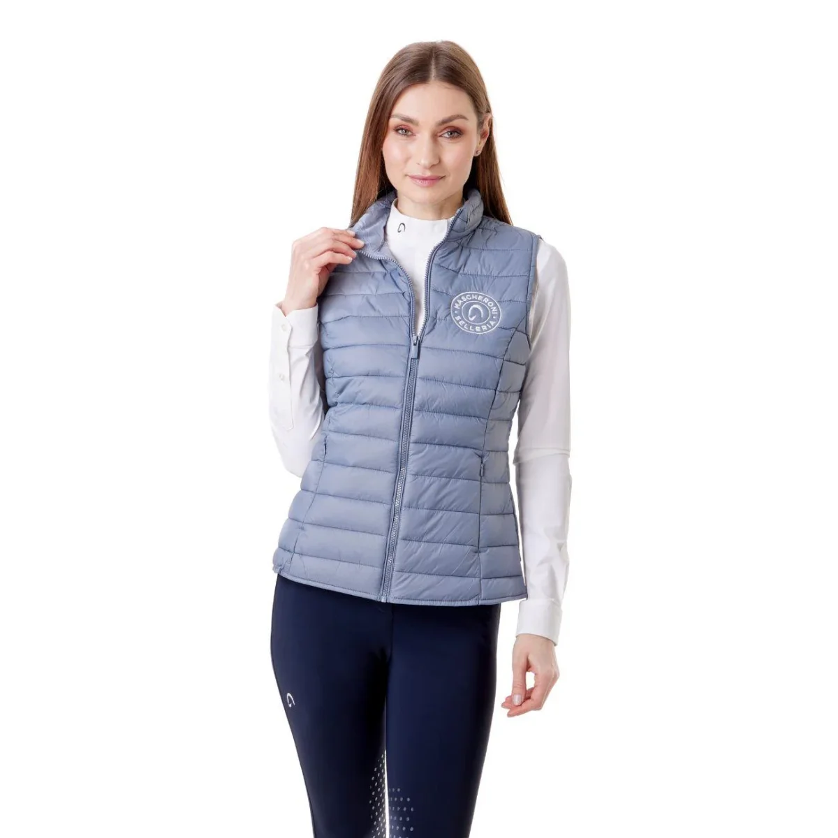 Gilet imbottito da donna Mascheroni Selleria, caratterizzato da un design trapuntato orizzontale. Dotato di chiusura full-zip e collo alto protettivo, cerniere laterali e rifinito dal logo circolare ricamato sul petto.