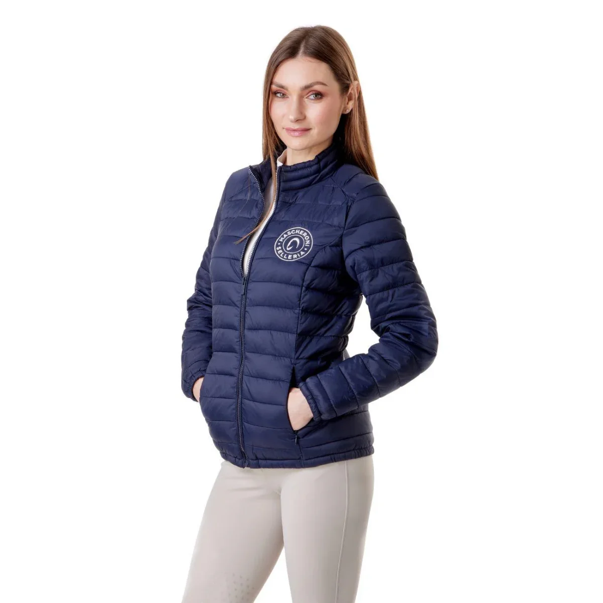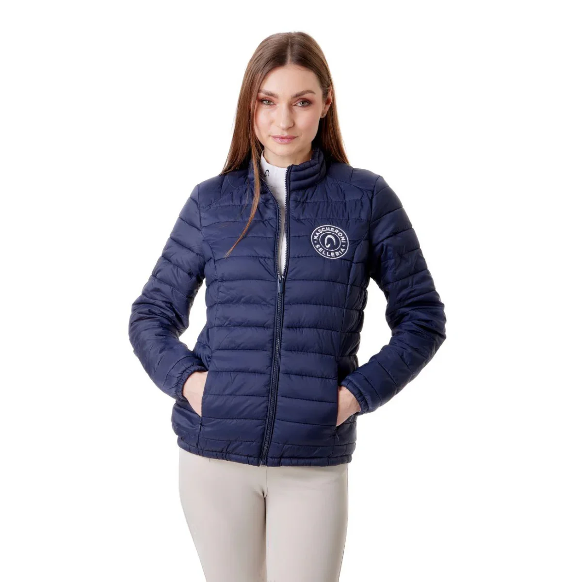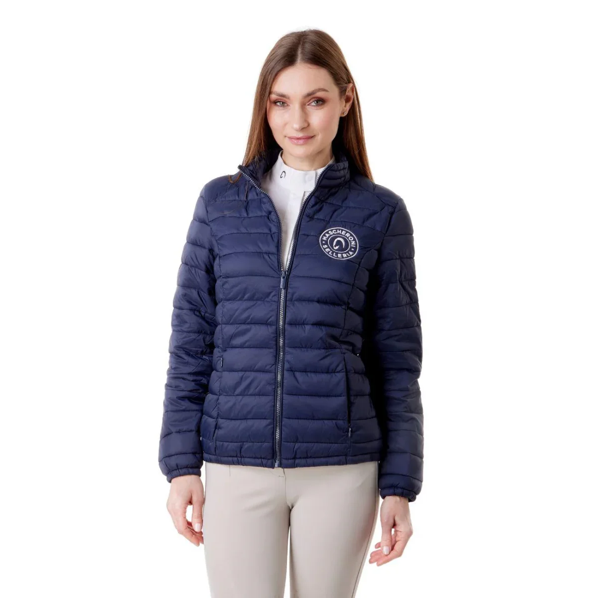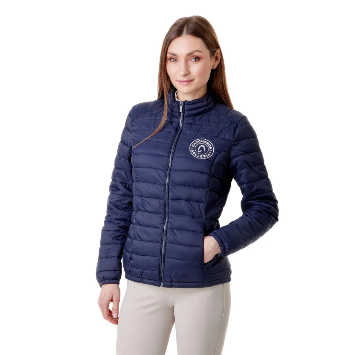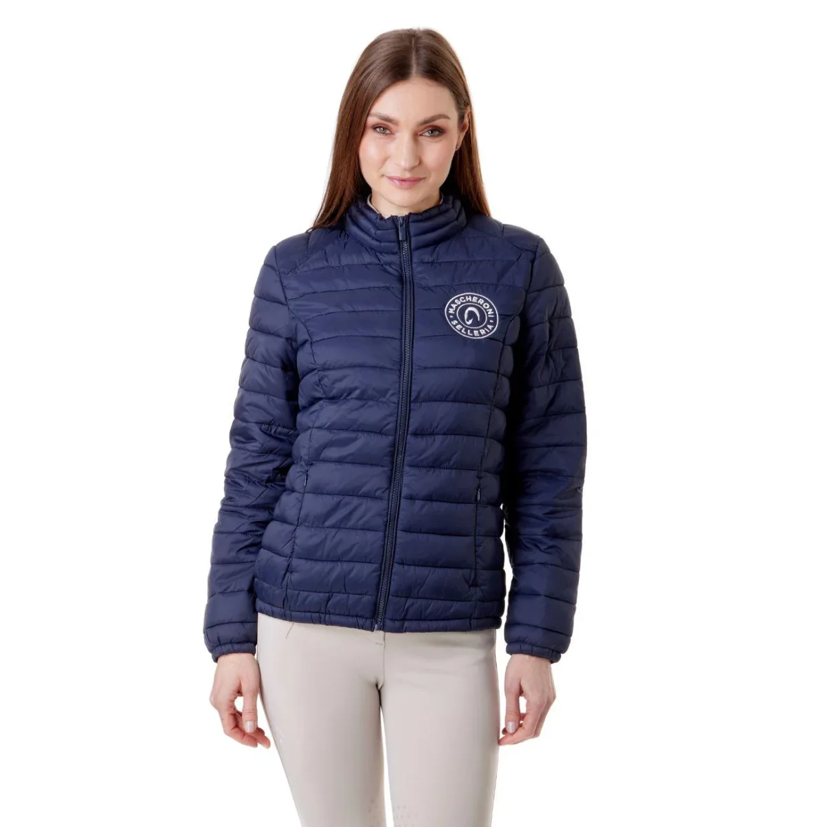Giubbino imbottito da donna Mascheroni Selleria, caratterizzato da un design trapuntato orizzontale. Dotato di chiusura full-zip e collo alto protettivo, cerniere laterali e rifinito dal logo circolare ricamato sul petto.