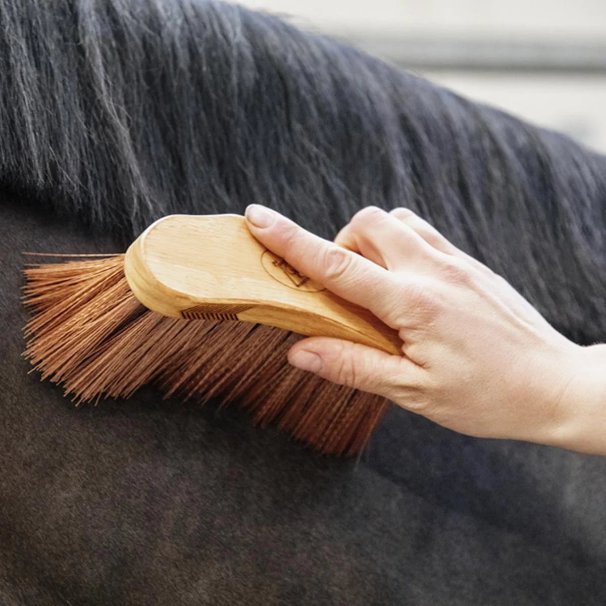 Spazzola in legno con setole morbide per la rifinitura quotidiana del mantello, delicata anche su cavalli tosati o sensibili.