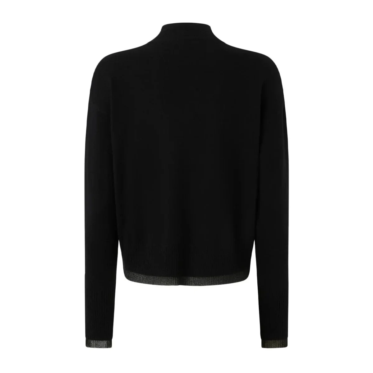 Lupetto DONNA – Modello: SPUMA – Colore: NERO LIMOUSINE Lupetto crop realizzato in morbida maglia di misto cachemire e lana, personalizzato con logo Love Birds ricamato a fondo capo. L’orlo è rifinito con il prezioso dettaglio di inserto a contrasto in maglia metallizzata. Il collo in piedi, i polsini e fondo capo sono lavorati a costine. COMPOSIZIONE: 90% Lana, 10% Cashmere