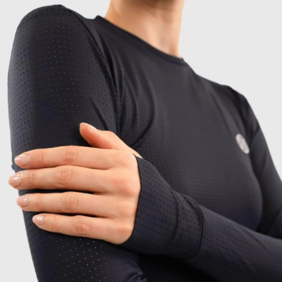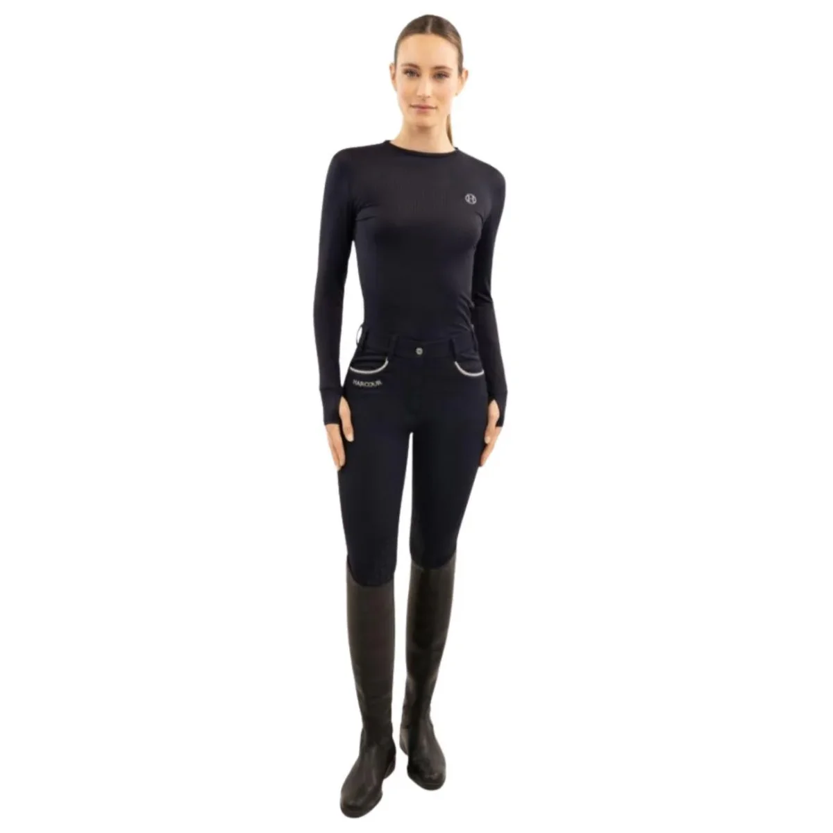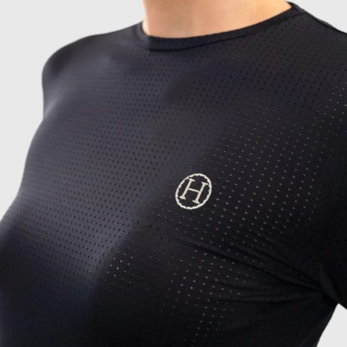 Maglia a manica lunga da donna in tessuto tecnico microforato e traspirante per un comfort ottimale e dal taglio aderente. Presenta sottomaniche in rete per una migliore ventilazione e polsini con foro per il pollice. Il logo Harcour ricamato in argento sul petto lato cuore completa il capo.