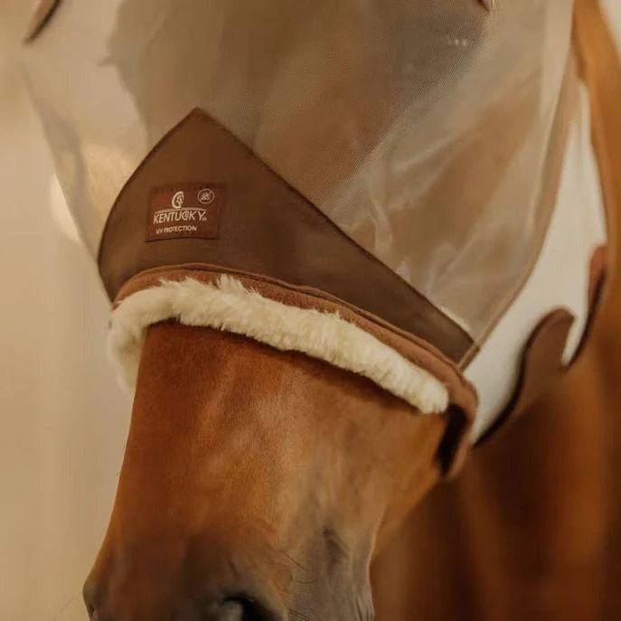 La maschera antimosche Skin Friendly di Kentucky è pensata per offrire massima protezione e comfort anche ai cavalli con pelle sensibile. Grazie all’inserto in agnellino sintetico posizionato sulla fronte e sul naso, previene sfregamenti e fastidi, mantenendo al contempo un’efficace barriera contro gli insetti. Il tessuto a rete è estremamente resistente, ultra-traspirante e 100% anti-UV, ideale anche nelle giornate più calde. Le orecchie sono completamente coperte da un tessuto morbido e flessibile, mentre la chiusura a doppio velcro sotto la mandibola garantisce una vestibilità stabile e regolabile.