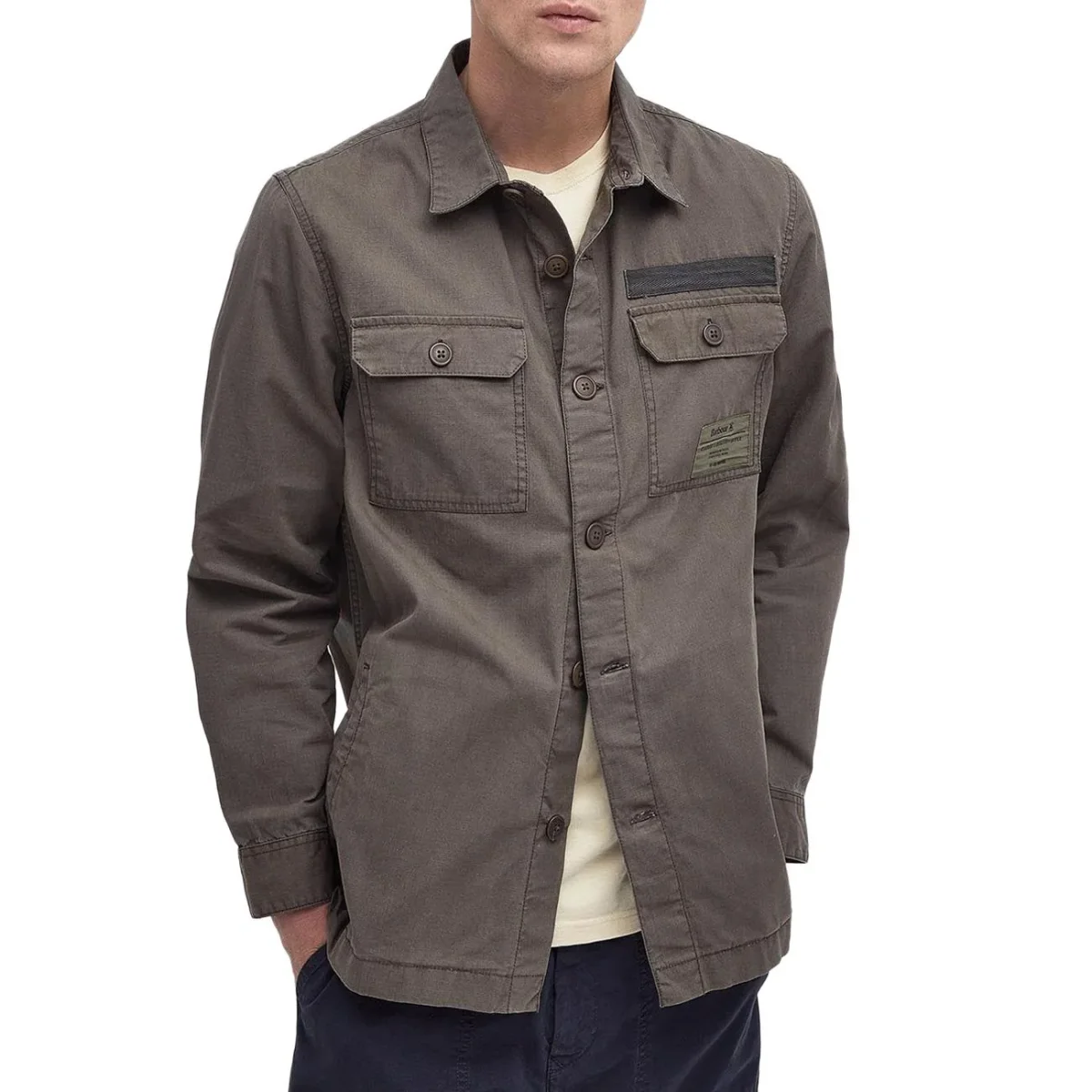 Overshirt UOMO – Modello: BILDAM – Colore: TARMAC Overshirt con tasche a toppa sul davanti. Realizzata in tela di cotone strutturato che rende il capo versatile sia da indossare come giacca che come camicia. Dettaglio chiusura con bottoni ed etichetta con logo Barbour JBS Supply. COMPOSIZIONE Esterno: 100% cotone Applicazione a spina di pesce: 100% cotone