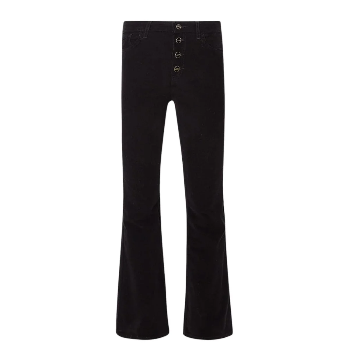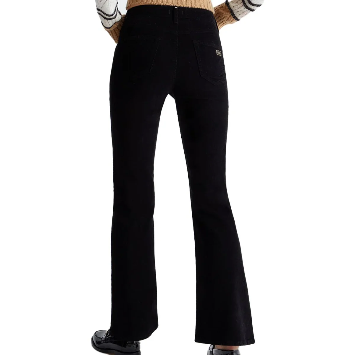 Pantalone DONNA – Modello: PANTALONE ZAMPETTA IN VELLUTO – Colore: NERO Pantaloni cinque tasche a vita alta bootcut realizzati in velluto di cotone stretch, presentano lavorazione a costine e piega stirata. Dettaglio logo in metallo sul retro e chiusura con bottoni. COMPOSIZIONE: 98% Cotone, 2% Elastan Codice produttore: MF3258T4416