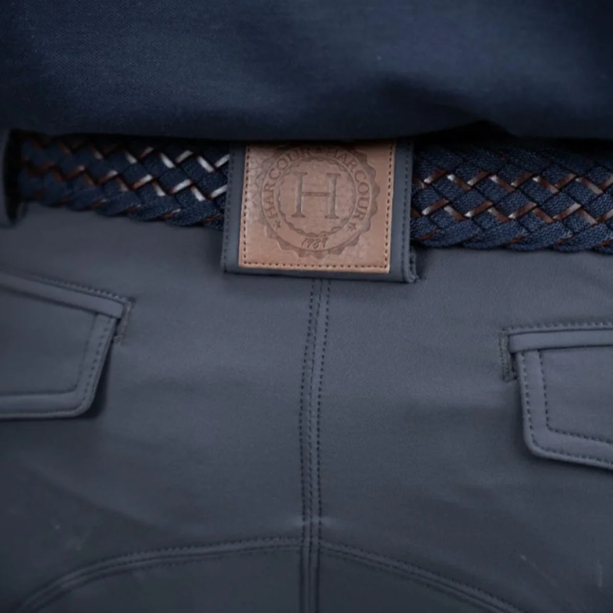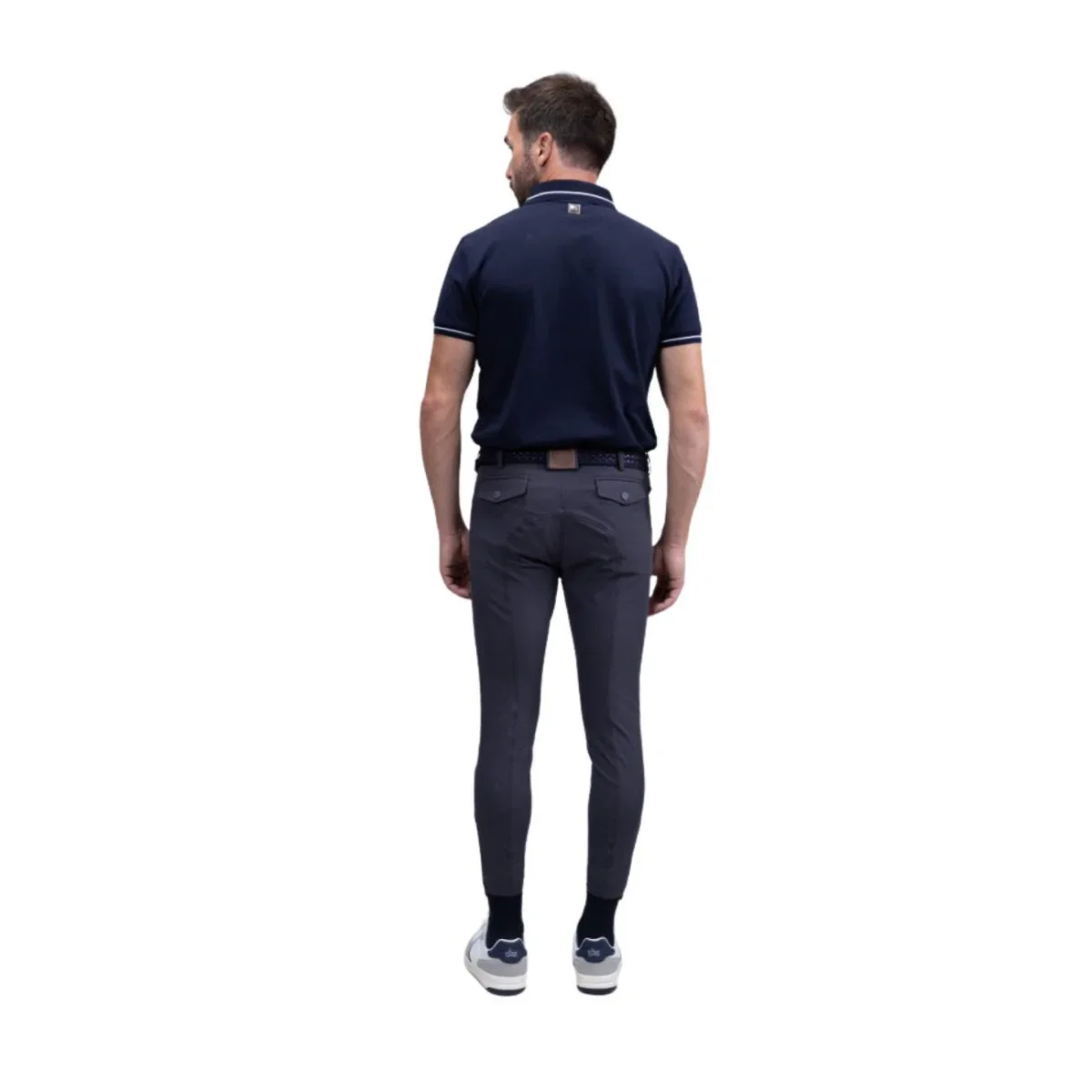 Pantaloni da equitazione aderenti da uomo realizzati in tessuto idrorepellente, bielastico, ad asciugatura rapida con grip in silicone al ginocchio. Tasche anteriori e posteriori, tasca destra ricamata e un passante per la cintura in pelle lavabile completano il design.