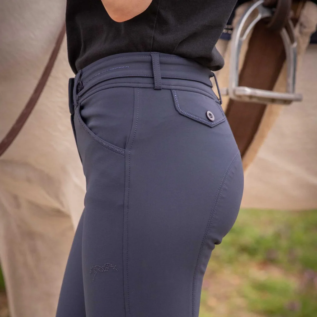 Pantaloni da equitazione Elegance Pénélope con una fila di strass sulla cintura e lungo le due tasche anteriori e posteriori. Il logo Pénélope, anch’esso decorato con strass, è posizionato al centro della gamba sinistra. Questi pantaloni offrono un comfort eccezionale grazie al tessuto elasticizzato, con rinforzi antiscivolo all’interno delle ginocchia e una vita leggermente alta e aderente. Il fondo gamba è realizzato in lycra per adattarsi a diverse corporature.