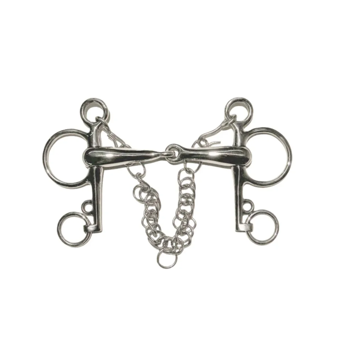 Pelham spezzato in due ad aste corte. Imboccatura 19 mm, aste 105 mm. Acciaio inox.