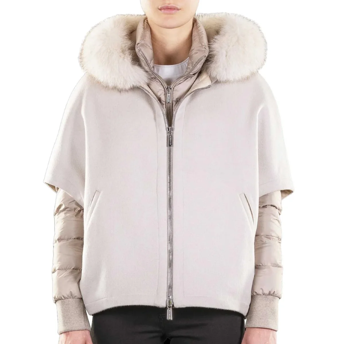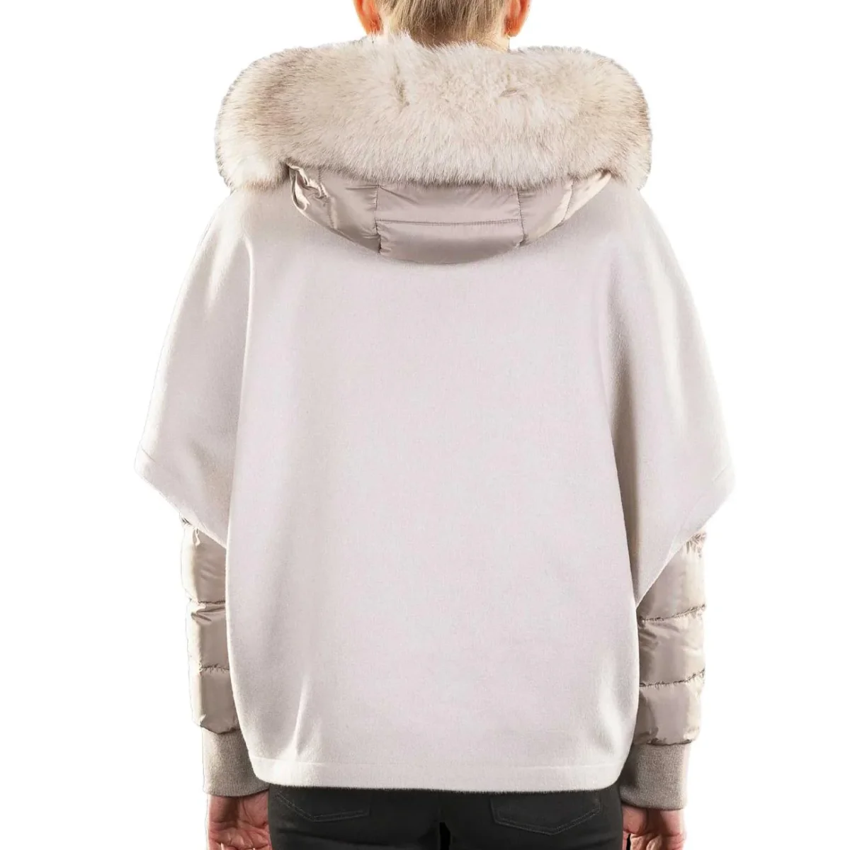 Piumino DONNA – Modello: PEGASO-CWR – Colore: MARBLE Un capo super delicato realizzato in morbida lana misto cashmere. Presenta collo in maglia abbinata a giacca interna staccabile trapuntata imbottita in finissima piuma d’oca. Possiede elegante cappuccio rifinito con bordo in vera volpe. COMPOSIZIONE: 90% Lana, 10% Cashmere Imbottitura in finissima piuma d’oca Codice produttore: MODGI300009