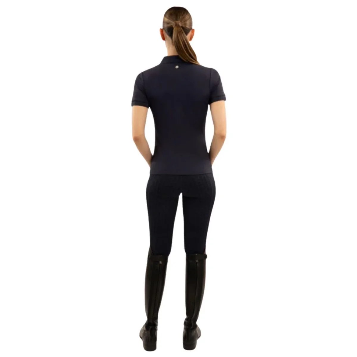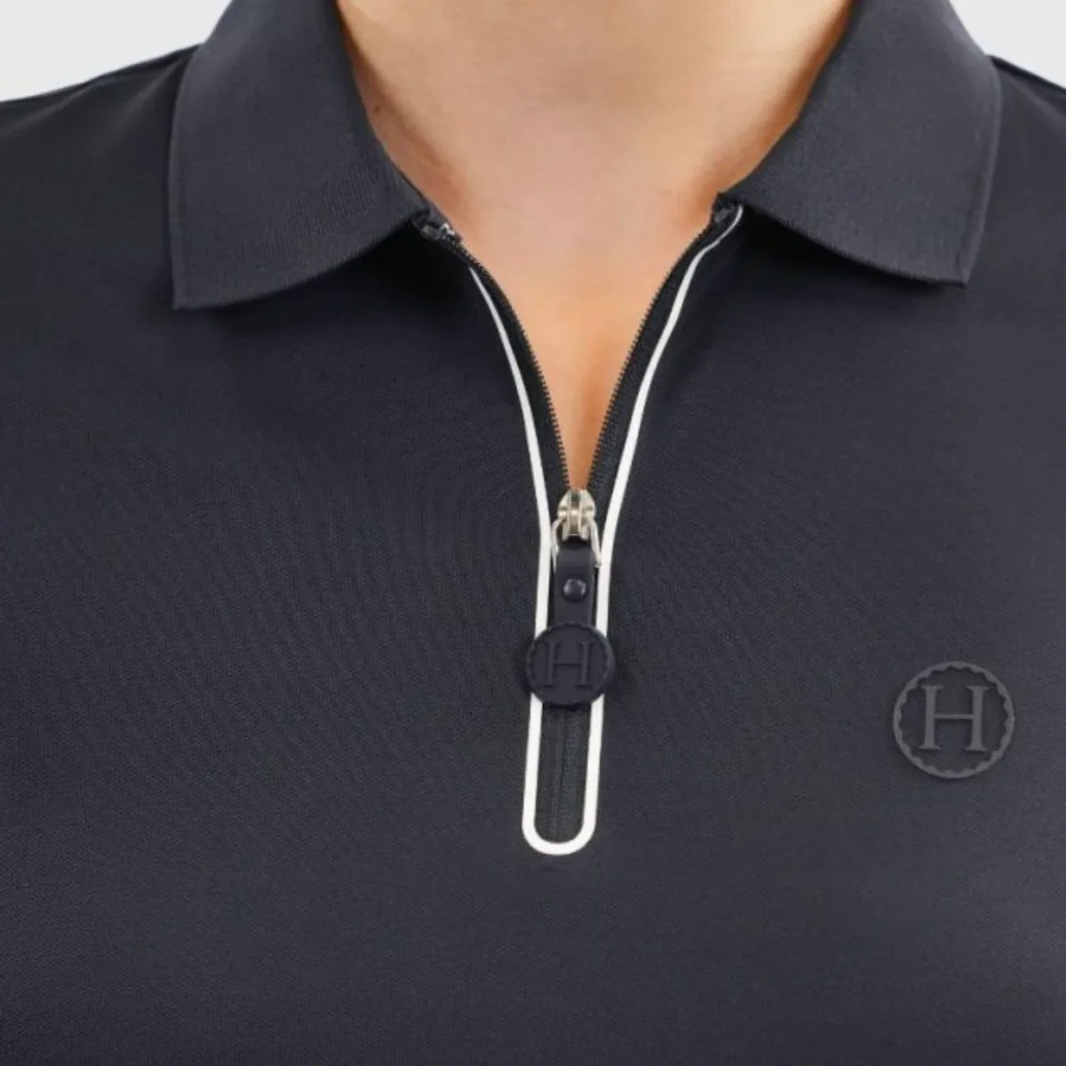Polo tecnica a manica corta da donna dal taglio aderente in tessuto leggero e traspirante per un comfort ottimale. Presenta colletto e polsini a coste, chiusura con cerniera, linguetta in silicone con logo Harcour, bottone inciso nella parte superiore della schiena e logo sul petto.