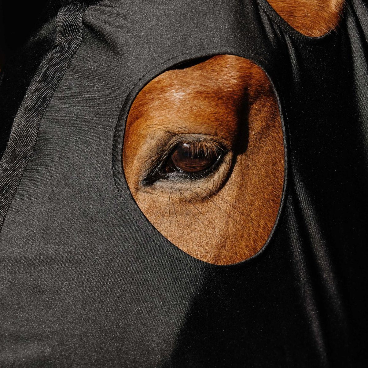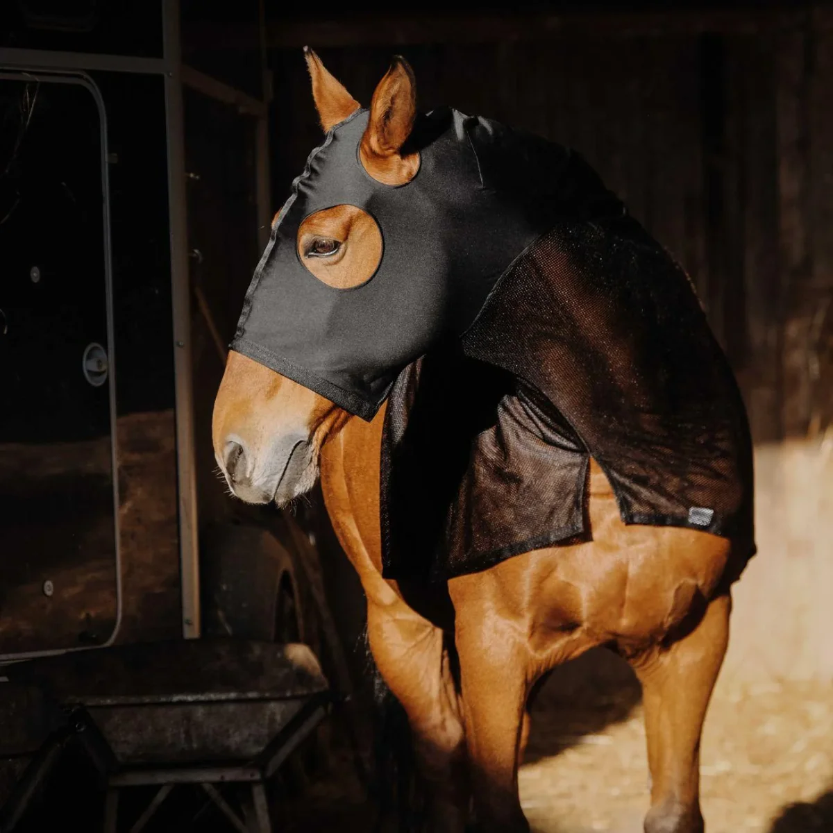 Protezione per assicurare confort e massima protezione al cavallo grazie all’apertura all’altezza delle spalle; un rinforzo della fodera sulla colonna vertebrale; rete per proteggere dalle mosche; foro all’altezza delle orecchie e degli occhi ed un elastico alla gola.