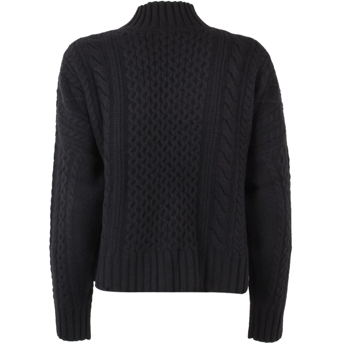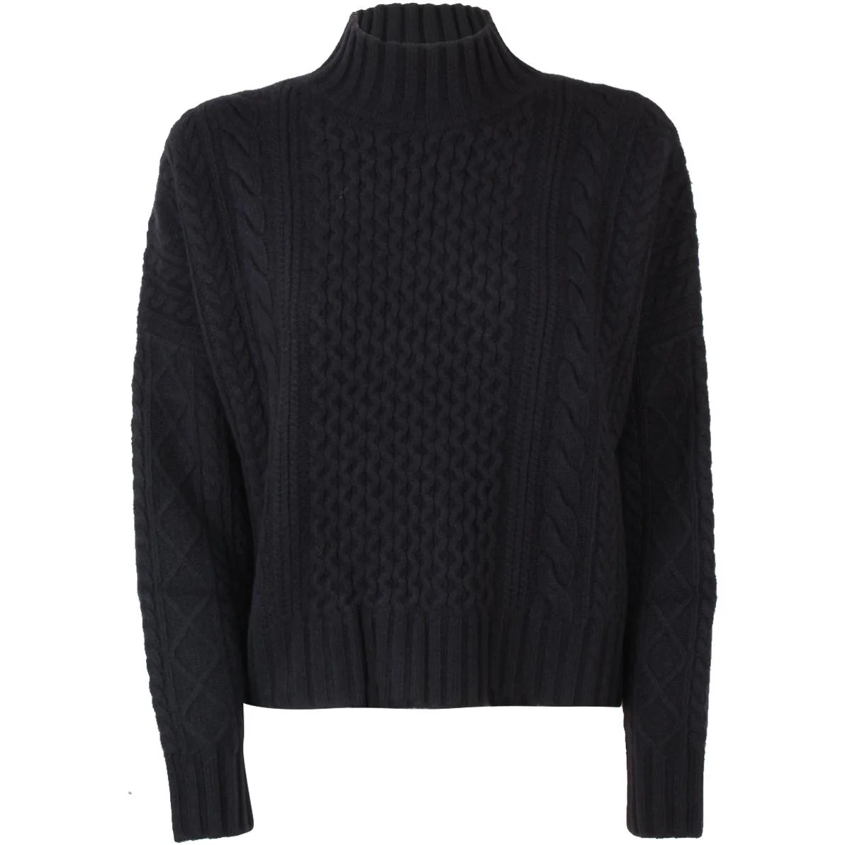 Pull DONNA – Modello: PULL ROBERTA – Colore: NAVY UNITO Maglia in filato di pura lana cardata, dalla linea boxy e con volume over. Il capo presenta collo alto montante e maniche lunghe a giro basso. La lavorazione a trecce e losanghe caratterizza il capo. Lunghezza 53 cm. COMPOSIZIONE: 100% lana vergine