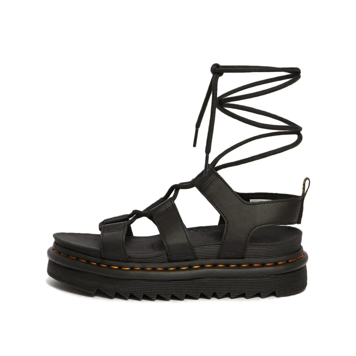Sandali DONNA – Modello: NARTILLA – Colore: BLACK HYDRO I Nartilla sono sandali minimal, caratterizzati da lacci unici che si legano alla caviglia in stile gladiatore, una suola 100% in PVC, leggera e resistente e un platform con un effetto scanalato. Presentano la classica fettuccia posteriore con logo e le cuciture gialle a vista che incarnano il DNA Dr Martens. COMPOSIZIONE: Tomaia: 100% Coated Pelle Codice produttore: 24641001