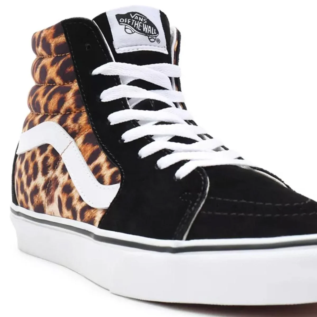 Sneakers DONNA – Modello: SK8-HI LEOPARD – Colore: BLACK TRUE WHITE Vans Sk8 Hi dal taglio alto in suede nero con banda in pelle bianca, e tessuto con stampa leopardata. Collare imbottito e suola in gomma bianca. Codice produttore: VANS-VN0A4U3C