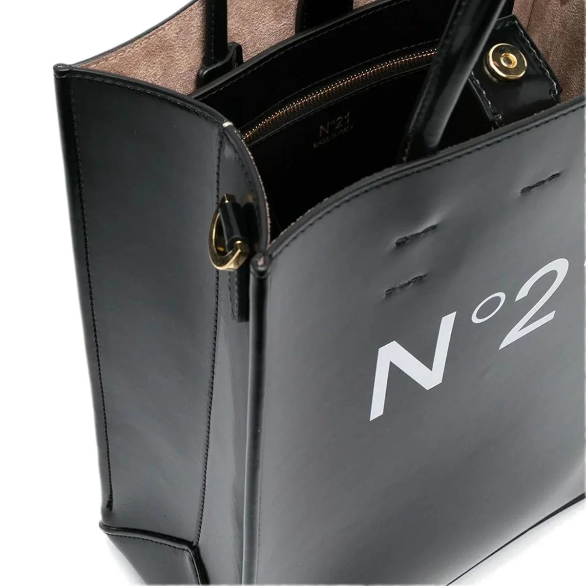 Borsa DONNA – Modello: SHOPPING BAG PICCOLA – Colore: BLACK Borsa shopper piccola in ecopelle nera lucida con logo N.21 in contrasto, doppio manico e tracolla in tessuto regolabile e removibile. Chiusura con bottone automatico. Ampio spazio interno e taschina piatta con zip. DIMENSIONI: 30 x 22,5 X 11 cm
