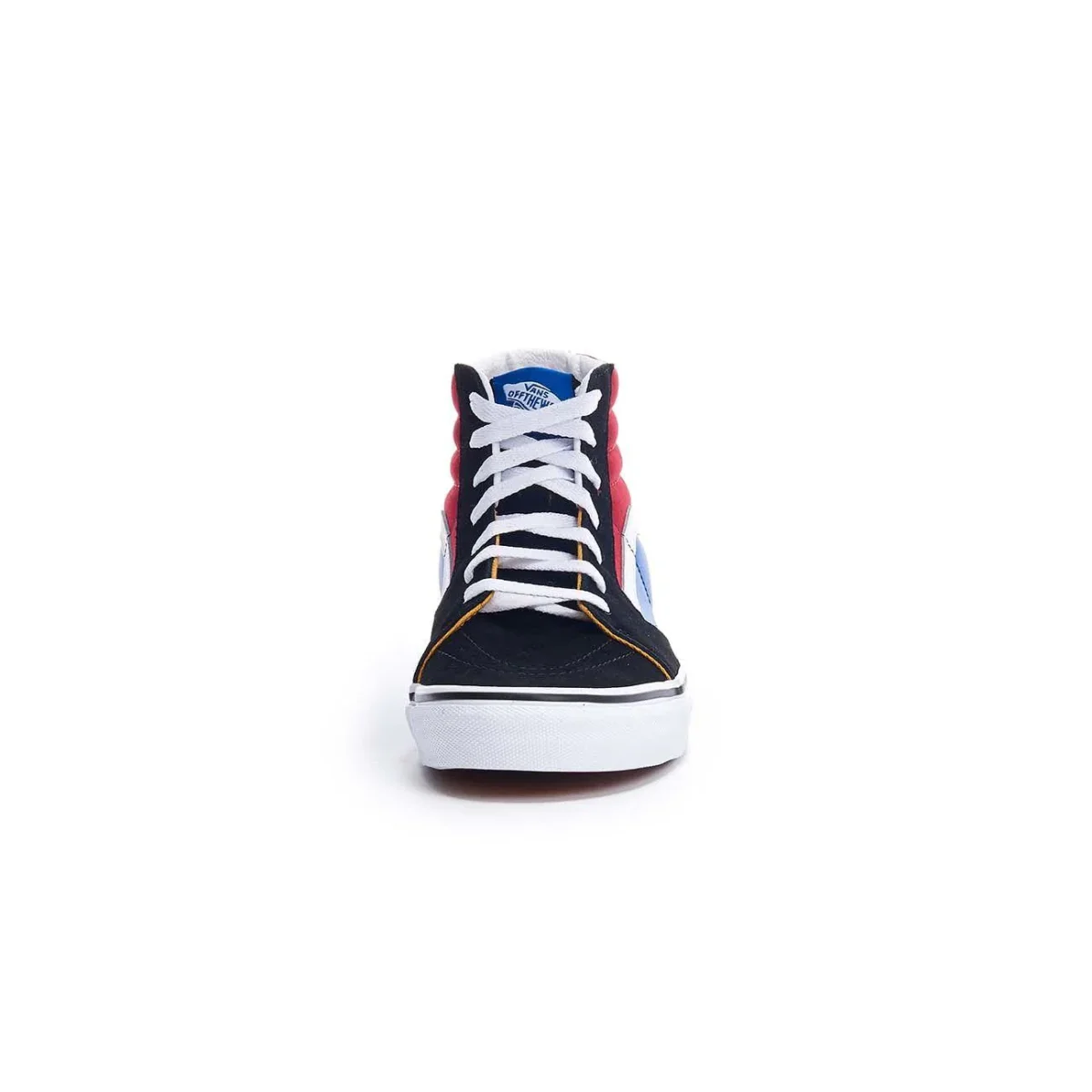 Sneaker alta in tessuto con inserti in ecopelle color blu, nero e rosso. Banda laterale bianca, collo imbottito e suola in gomma bianca.