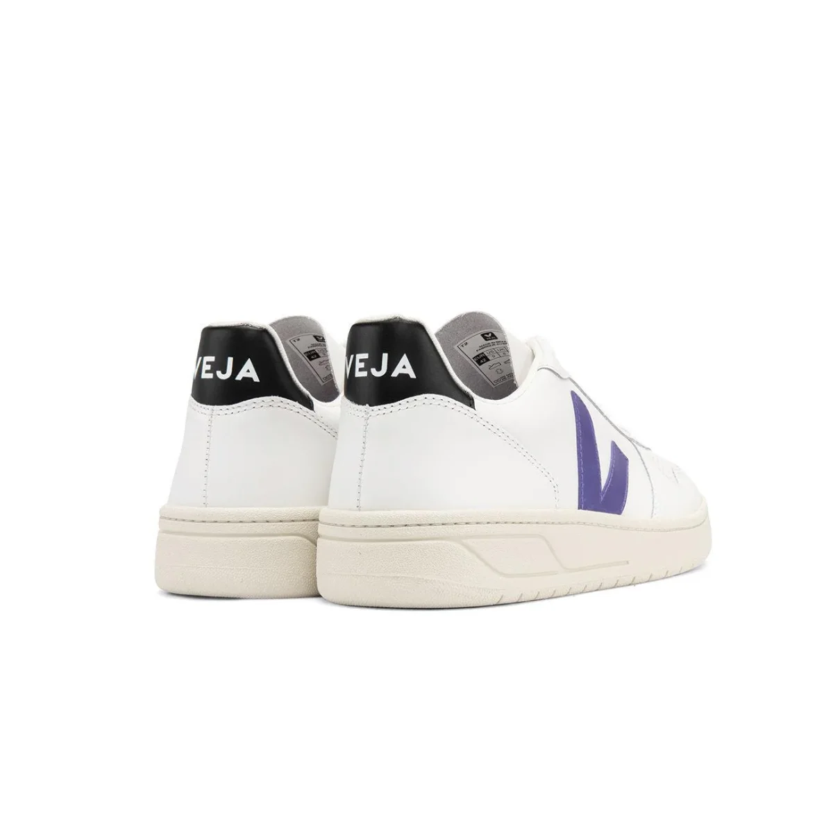 Sneakers UOMO – Modello: V-10 – Colore: WHITE PURPLE BLACK Sneakers in pelle bianca con logo V viola e tallone in pelle nero. Punta traforata, Suola in gomma riciclata misto materiali alternativi. Lacci in cotone biologico. Ecosostenibile. Codice produttore: VX022618