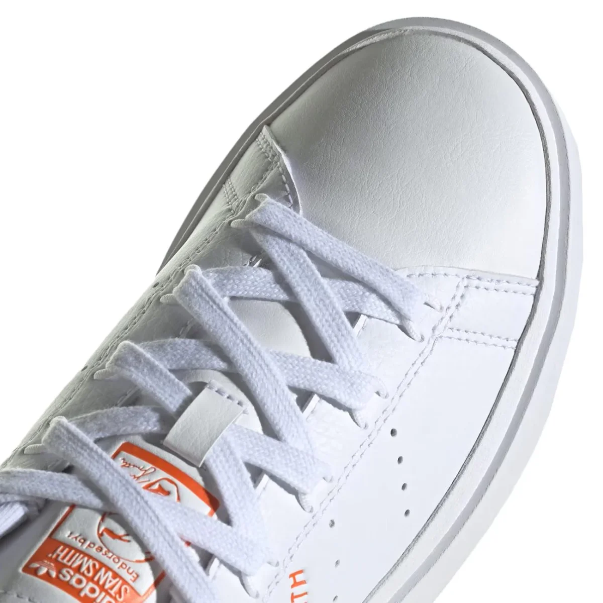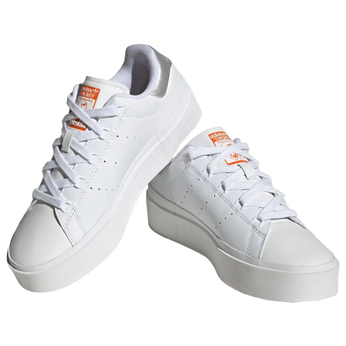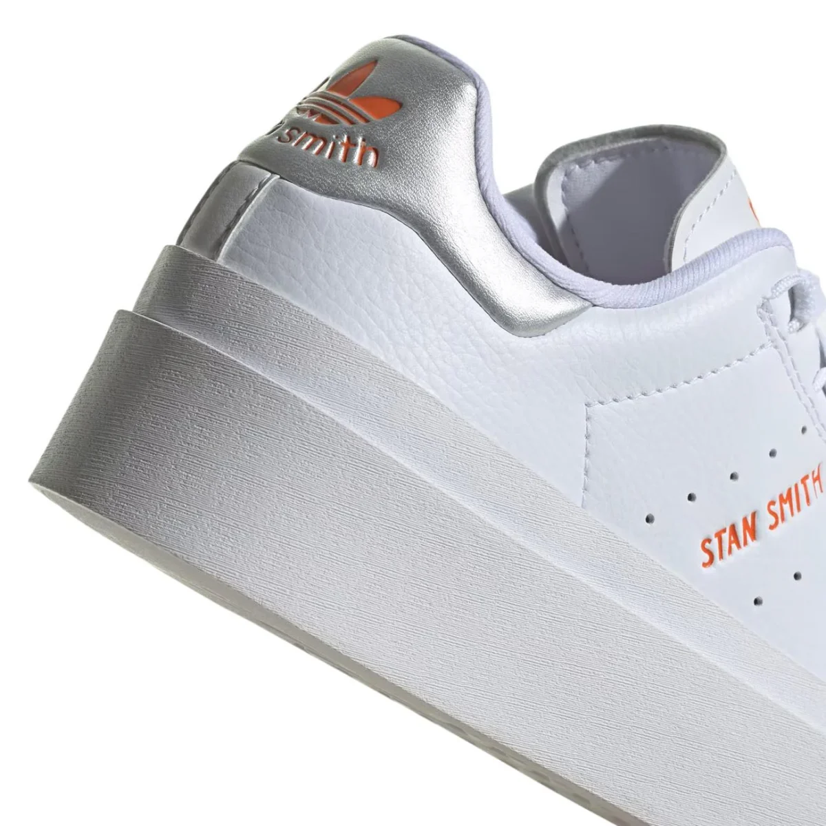 Le sneakers Stan Smith Bonega W di Adidas rivisitano l’iconico design tennistico con una moderna suola platform che eleva lo stile e la silhouette. La tomaia in pelle bianca è impreziosita da dettagli raffinati, come il patch argentato sul tallone e i loghi in un vivace arancione a contrasto. Le classiche tre strisce traforate assicurano traspirabilità , mantenendo l’estetica minimalista e pulita che ha reso celebre questo modello originale. Caratterizzate da una calzata confortevole e una chiusura con stringhe abbinate, rappresentano il perfetto equilibrio tra heritage sportivo e tendenze urban contemporanee. È la calzatura ideale per chi desidera un look versatile, capace di slanciare la figura senza rinunciare alla comodità quotidiana.
