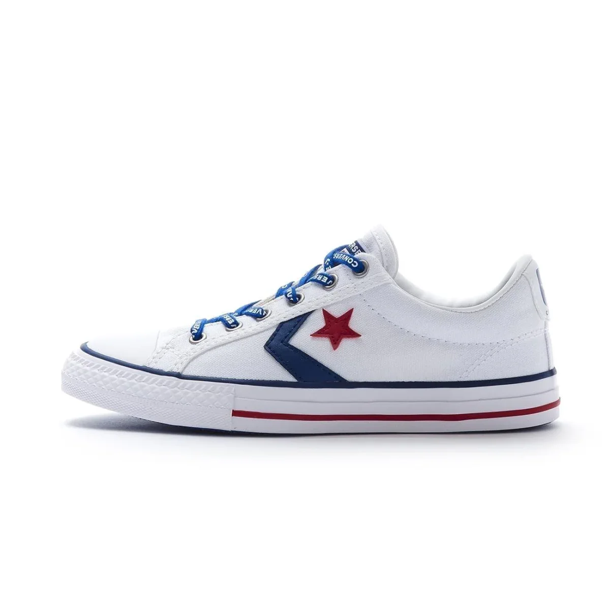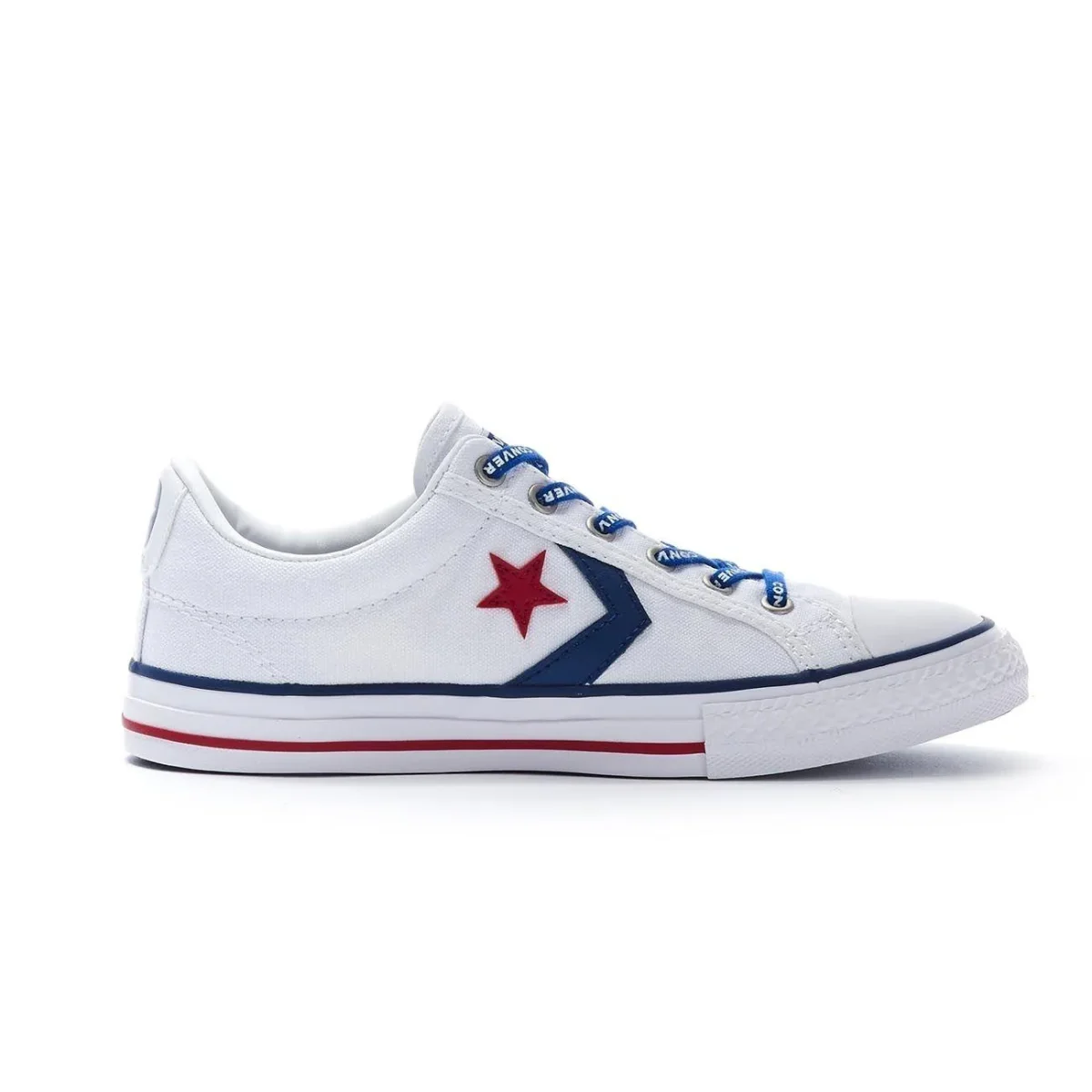 Sneakers BAMBINO – Modello: SNEAKERS STAR PLAYER EV OX – Colore: WHITE NAVY GYM RED Sneaker bassa con tomaia in tela bianca, punta in gomma e applicazione big logo blu e rosso su entrambi i lati. Lacci color cobalto con lettering del brand a contrasto, logo converse applicato sul tallone e label del brand sulla linguetta. Suola piatta in gomma bianca con righe rosse e blu. Codice produttore: 663992C