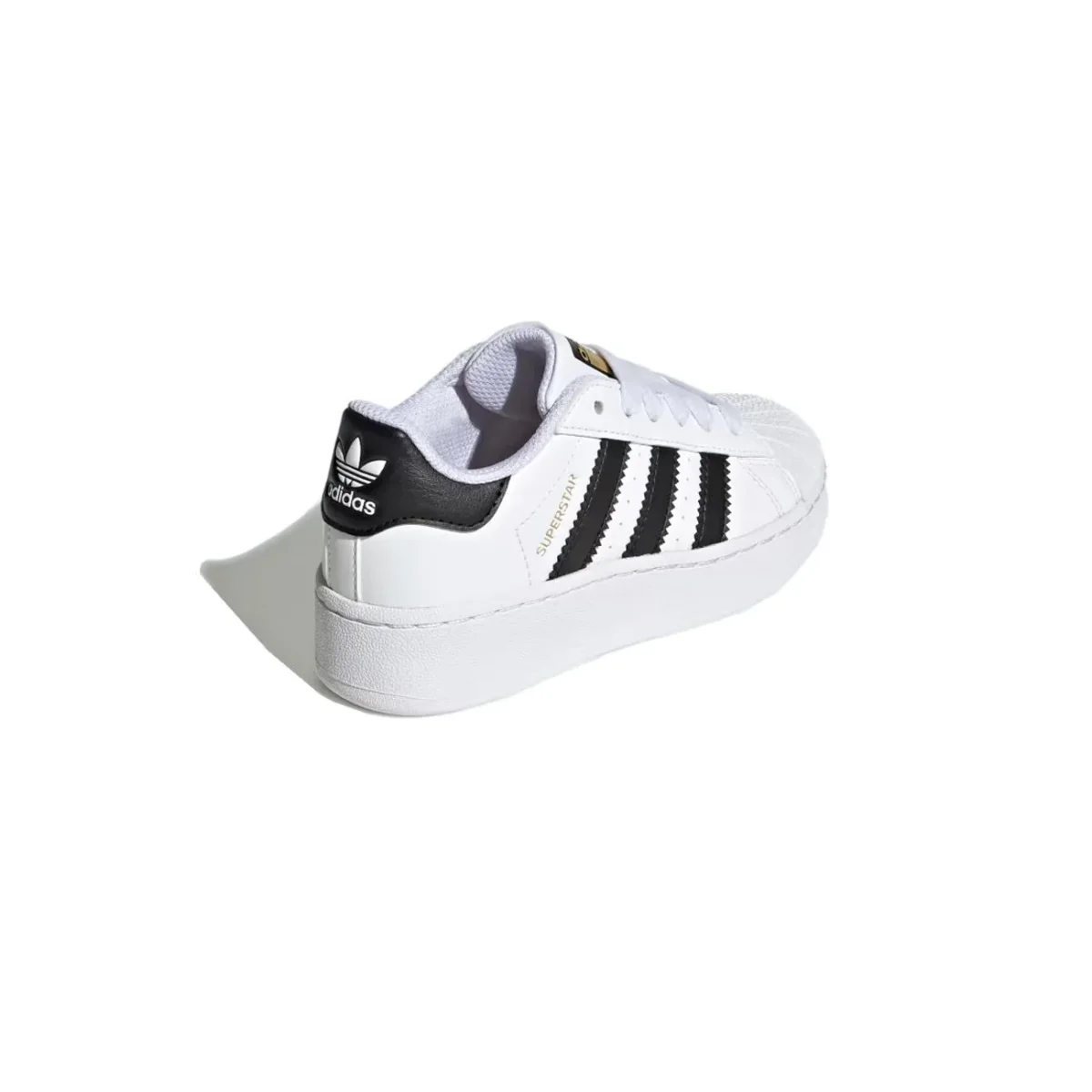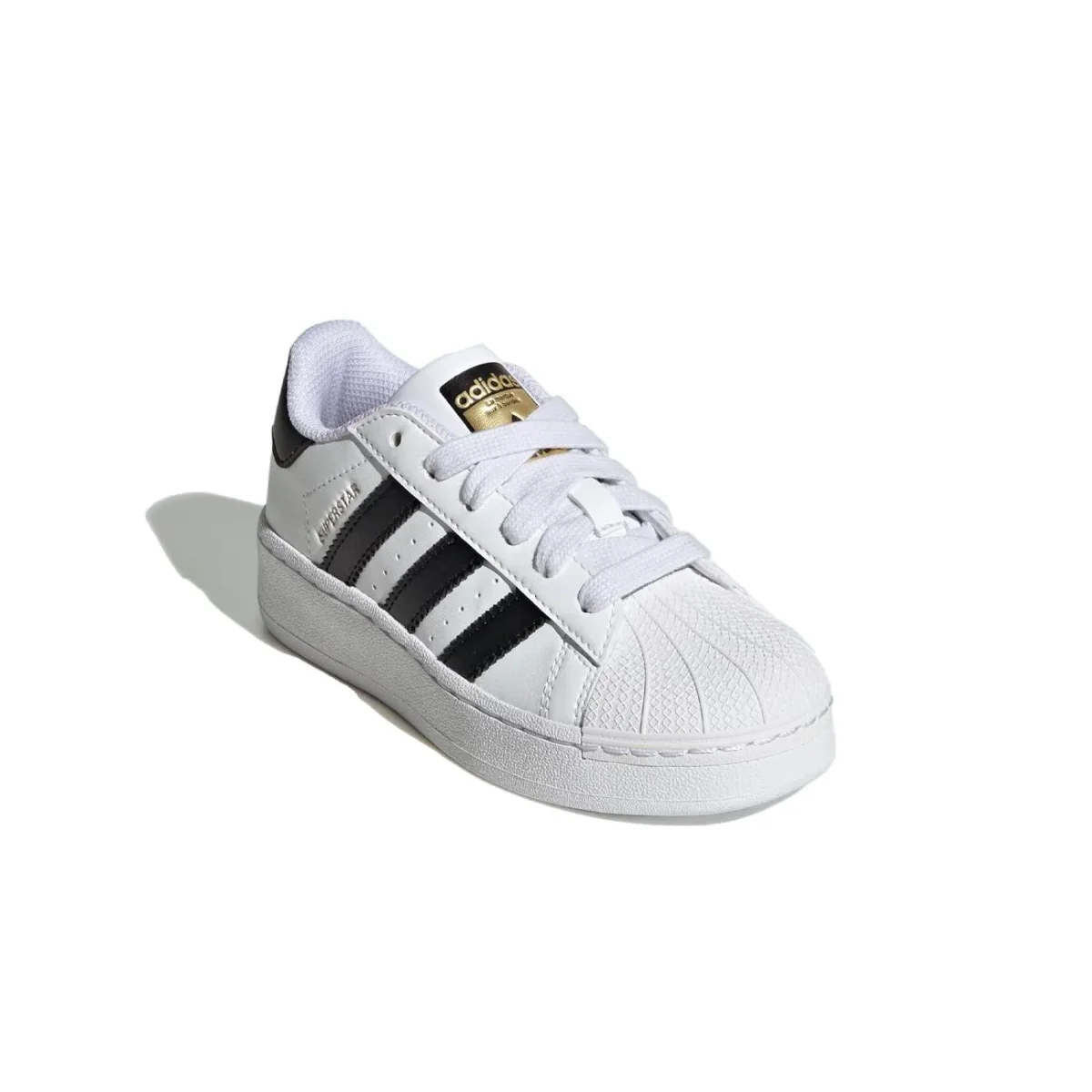 Sneakers BIMBO – Modello: SUPERSTAR – Colore: WHITE BLACK GOLD Storico modello di Adidas dal taglio basso segnato da dettagli distintivi. Tomaia in pelle bianca liscia, 3-Stripes nere e punta a conchiglia in gomma. Tallone a contrasto con Trefoil logo, lettering Superstar stampato in oro lateralmente e logo sulla linguetta.