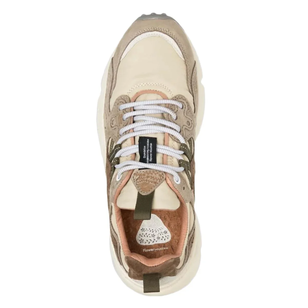 Sneakers UNISEX – Modello: YAMANO 3 – Colore: BIANCO/BEIGE Sneaker in tessuto tecnico con inserti in suede multicolor. Occhielli rinforzati e lacci trek. Soletta interna in sughero naturale antibatterico, fondo in gomma ultra leggera con battistrada dentellato.